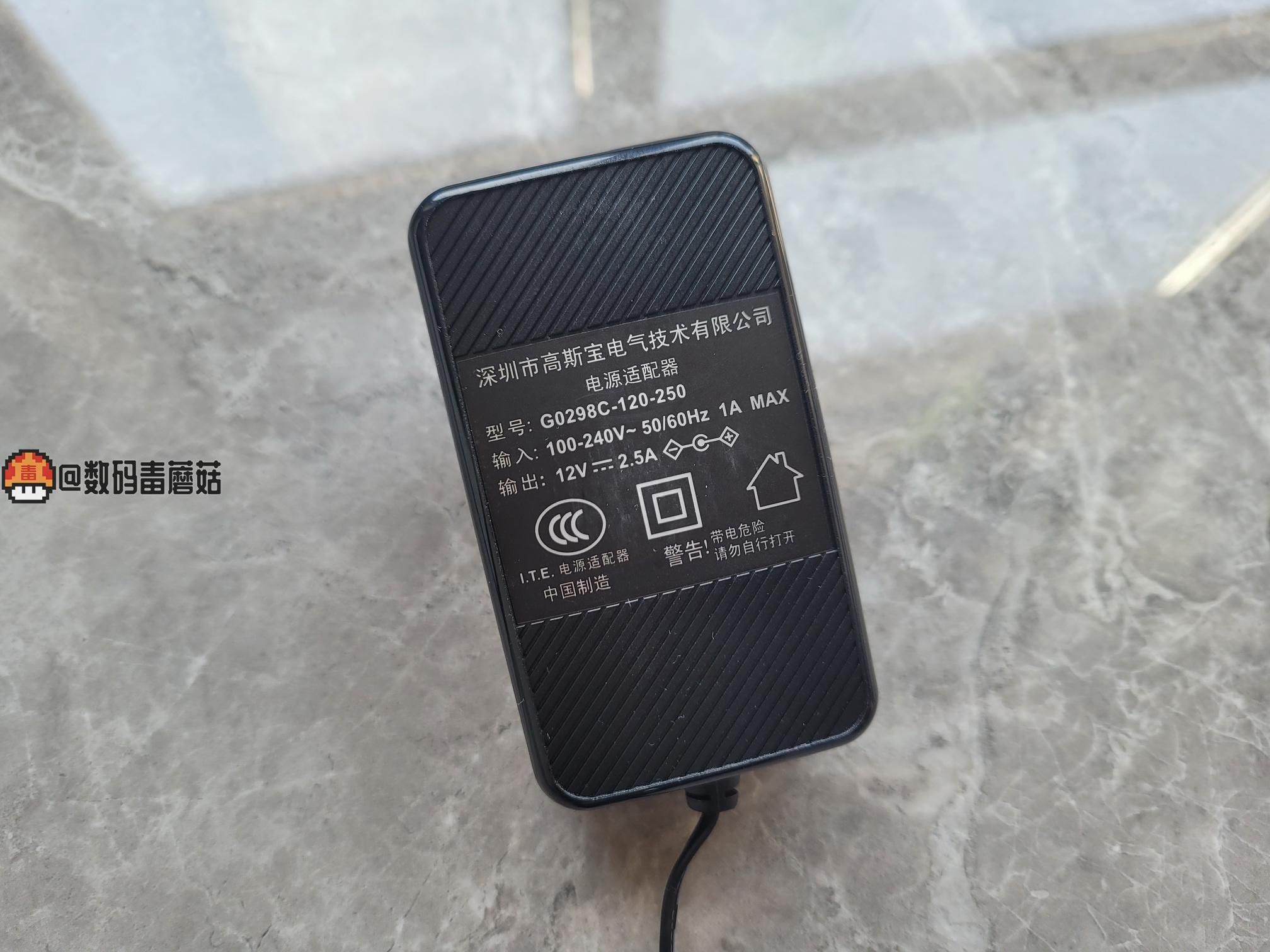 自带的电源是12v 2.5a,掂量着份量挺足,用料应该不错。