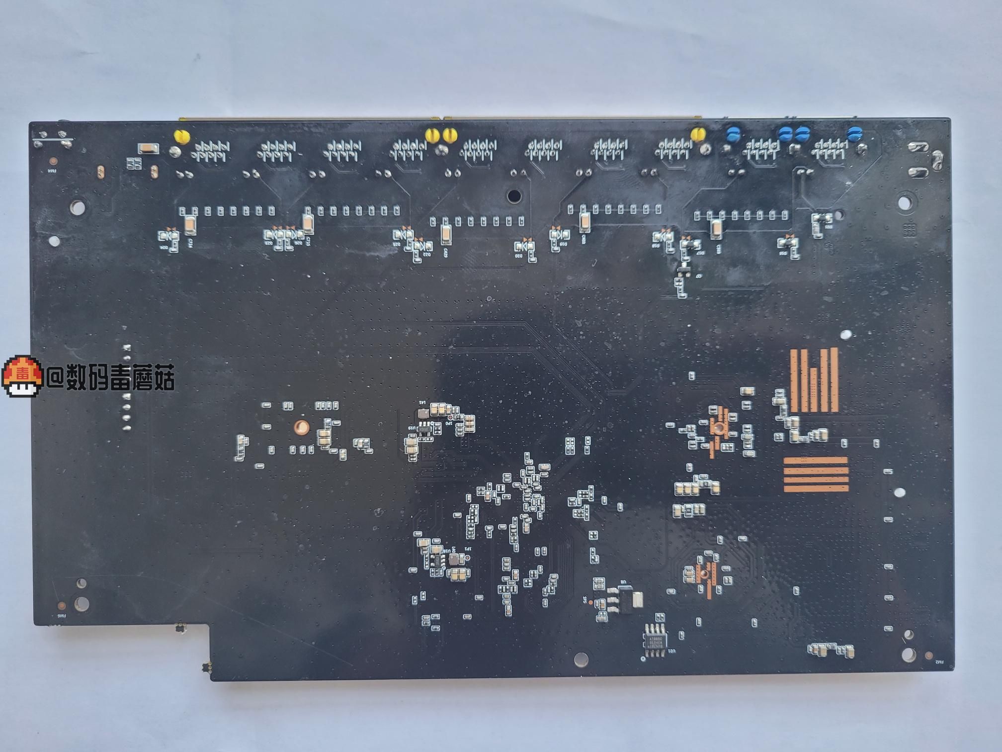 主板背面一览。大部分零部件都在正面。