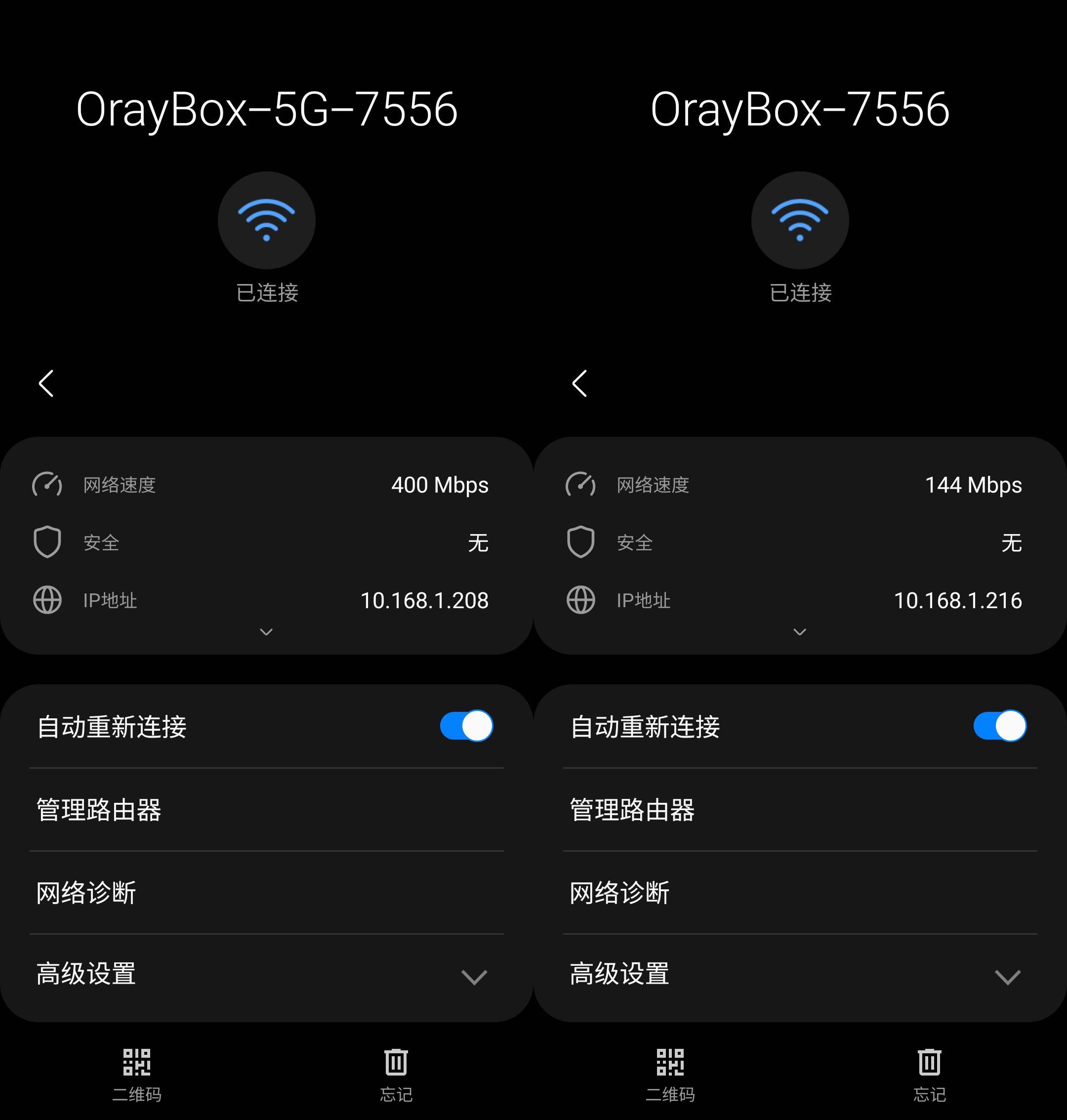 经过一通设置之后,连上路由会发现信号的确十分强,但是无论在远处测试还是贴在路由器上测试,最高网速都在300M左右。从手机端看了一下连接速率,发现5G速度只有400Mbps,2.4G只有144Mbps,这是为什么呢?
