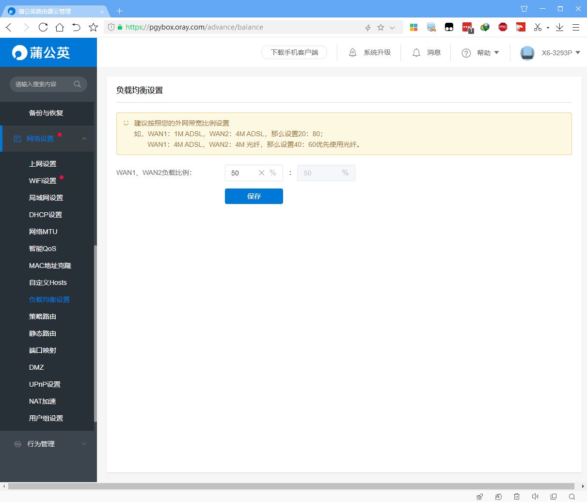 双WAN接入还需要设置一下负载均衡,非常简单,我的两条宽带都是300M,直接50:50就可以上网了~