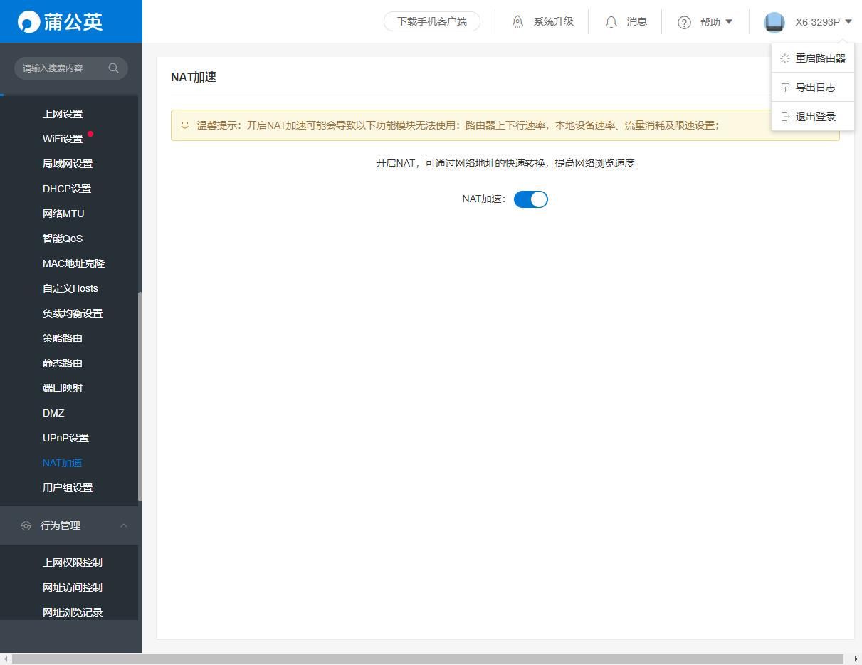 设置2在这里,要开启NAT加速,才能跑得更快。上图的温馨提示说,开启之后可能会导致部分模块无法使用,但是实际我看是可以用的。