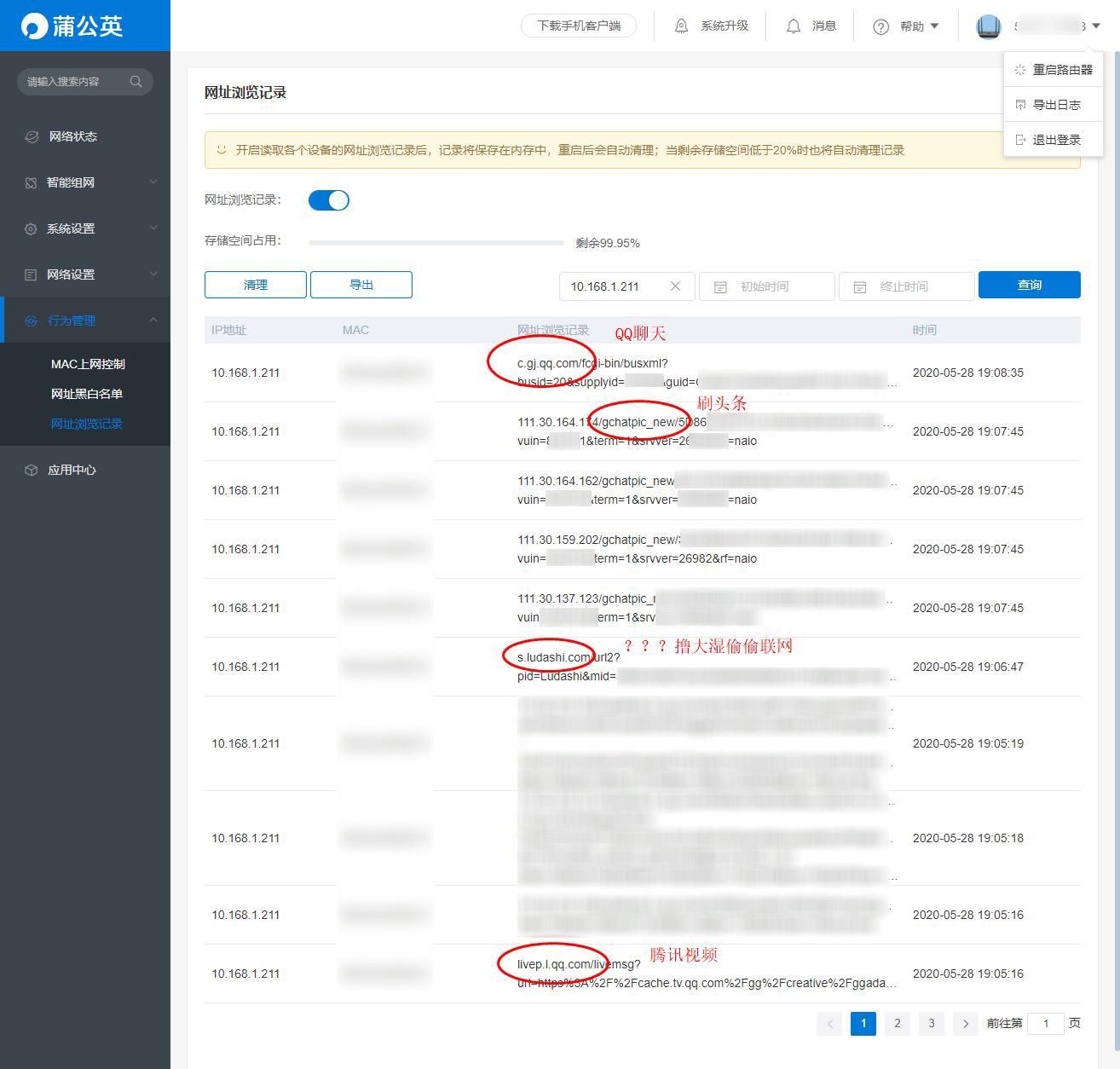 云端还有行为管理功能,比如可以通过翻看网址浏览记录,了解到家里熊孩子是开电脑还是玩手机、看电影还是玩游戏,全部一目了然……不好好学习?直接加进黑名单里去。