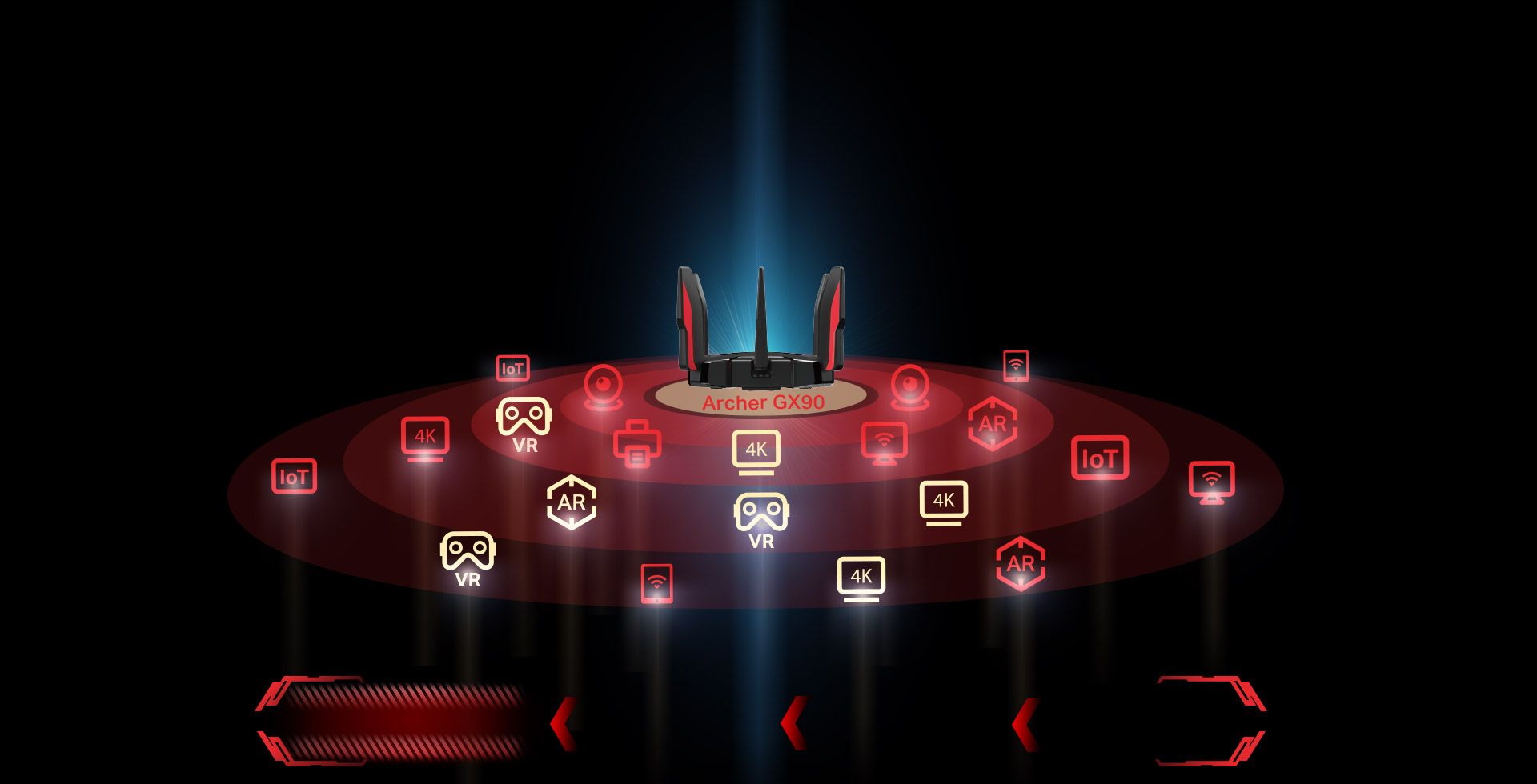 Archer GX90拥有专门的游戏频段,带宽比Archer C5400X的游戏频段带宽增大了一倍还多。Archer GX90拥有3个不同频段,组合速度高达6579Mbps。它功能齐全的游戏频段配备了4T4R和HE160技术,所有设备都能享受到4.8Gbps的最高速度,并能有效防止其它设备干扰。