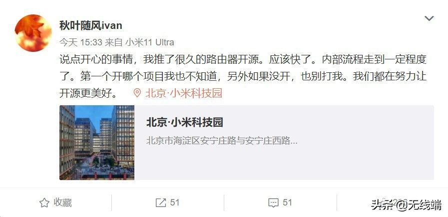 据7 月 3 日消息,小米知名工程师@秋叶随风ivan称,小米路由器的开源指日可待,“内部流程已经走到一定程度了”。