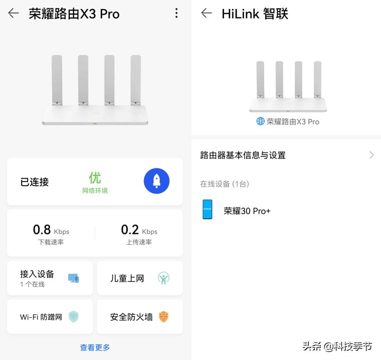 可以自动识别猿辅导、学而思、沪江网校、钉钉等学习应用,并保障在线网课软件数据优先发送,减少WIFI丢包和数据延迟,最大程度保障学生看网课的稳定性,在手机智慧生活中,也可以查看此时的下载速率、上传速率、接入设备、WIFI防蹭网、儿童上网、安全防火墙等。
