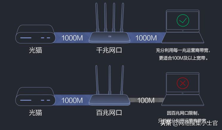 目前市面上的家用路由器,按照对宽带的支持情况分为:百兆路由器、千兆路由器、万兆路由器。在千兆网络环境下,我们应该选择千兆路由器或万兆路由器。至于百兆路由器应该都淘汰了,目前带宽都是百兆起步。