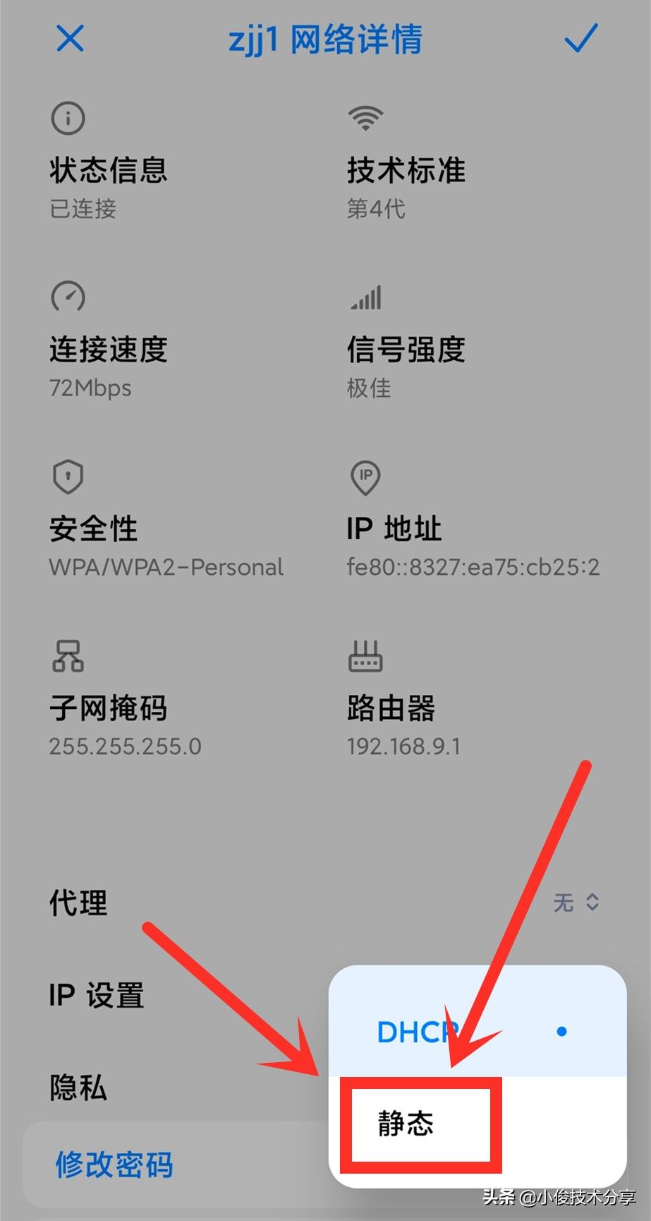 此时会打开wifi网络详情页面,在这里点击【IP设置】,把它选择更改为【静态】