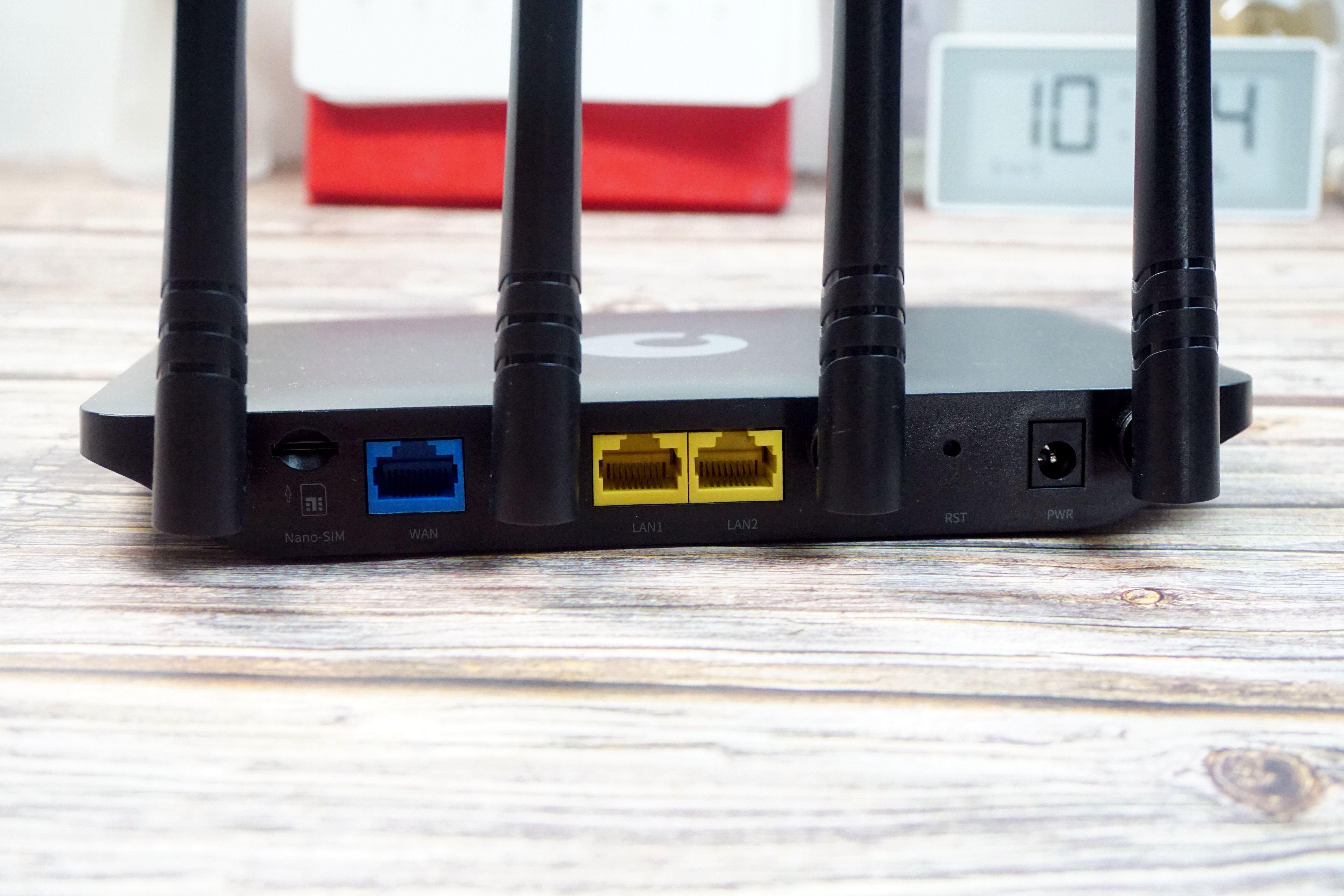背面是蒲公英X4C路由器的接口,从左到右依次是SIM卡插槽、WAN接口、2个LAN接口、1个PWR接口还有RST一键恢复按键。