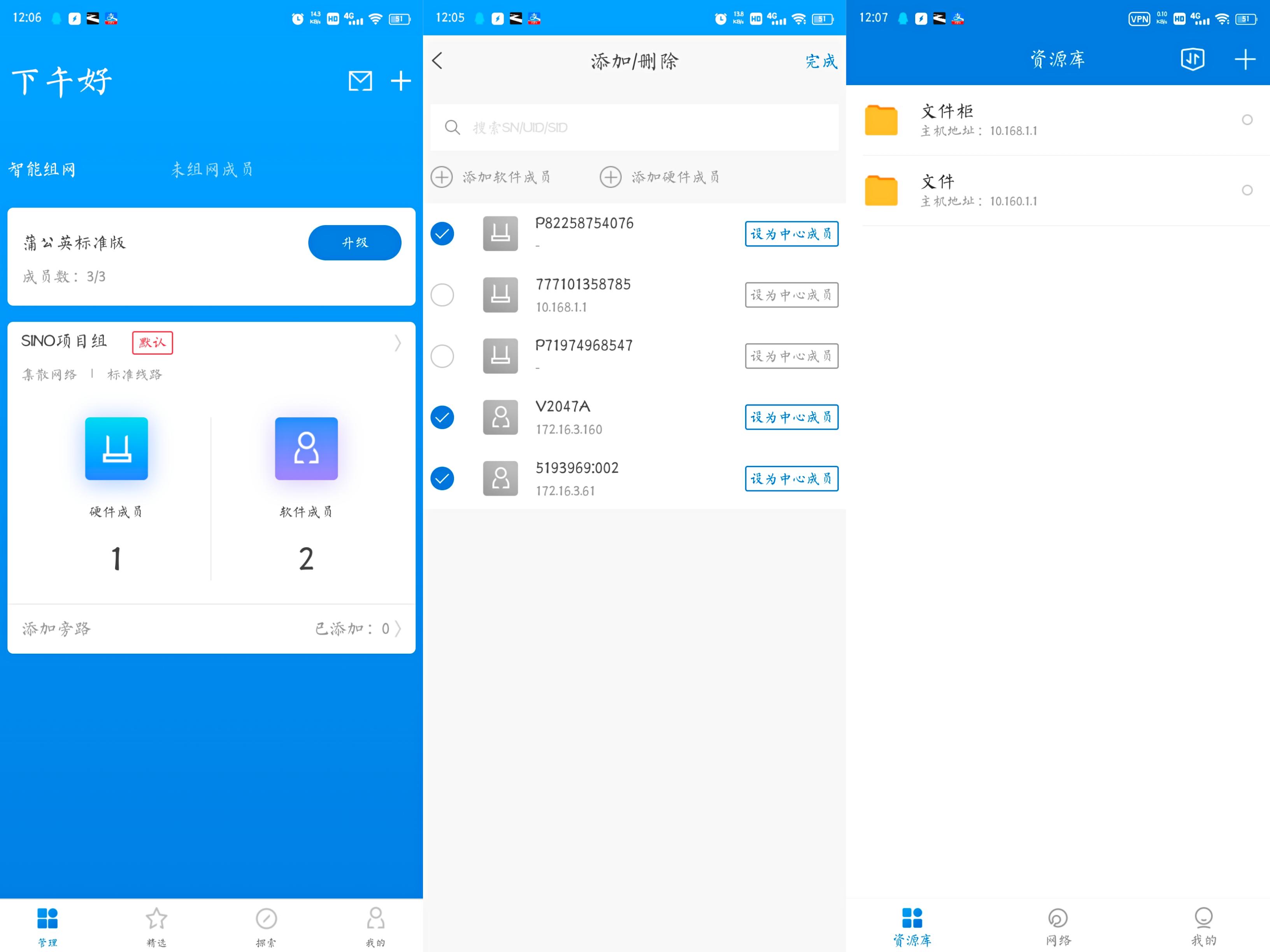 除了PC端可以智能组网之外,在蒲公英的APP端也可以智能组网,手机端操作起来更简单,同样 是先是建立网络名,在智能组网内选择需要接入的项目组内的硬件和软件成员即可。目前默认只支持3名成员接入,如果需要多成员则需要单独购买服务。