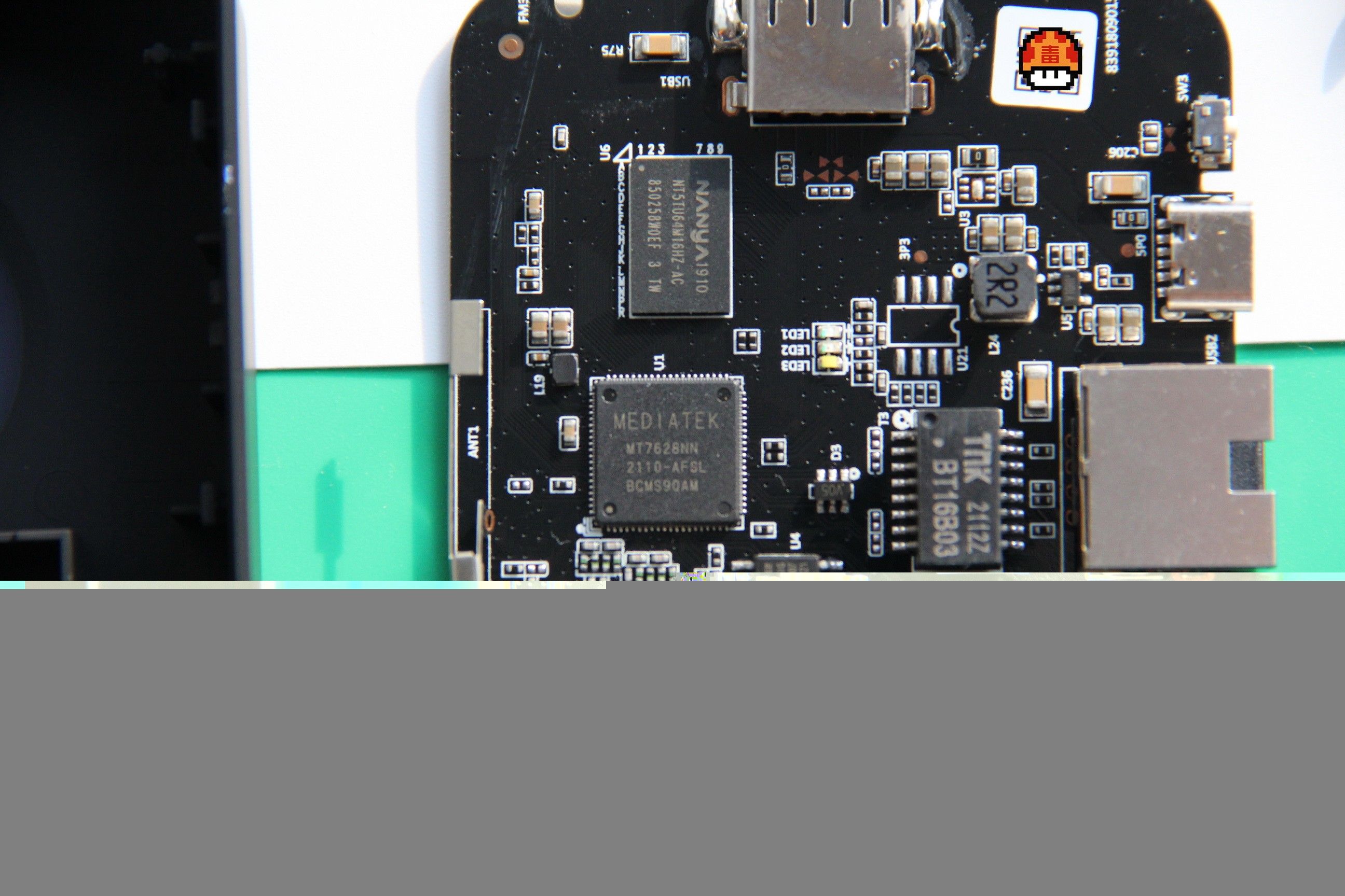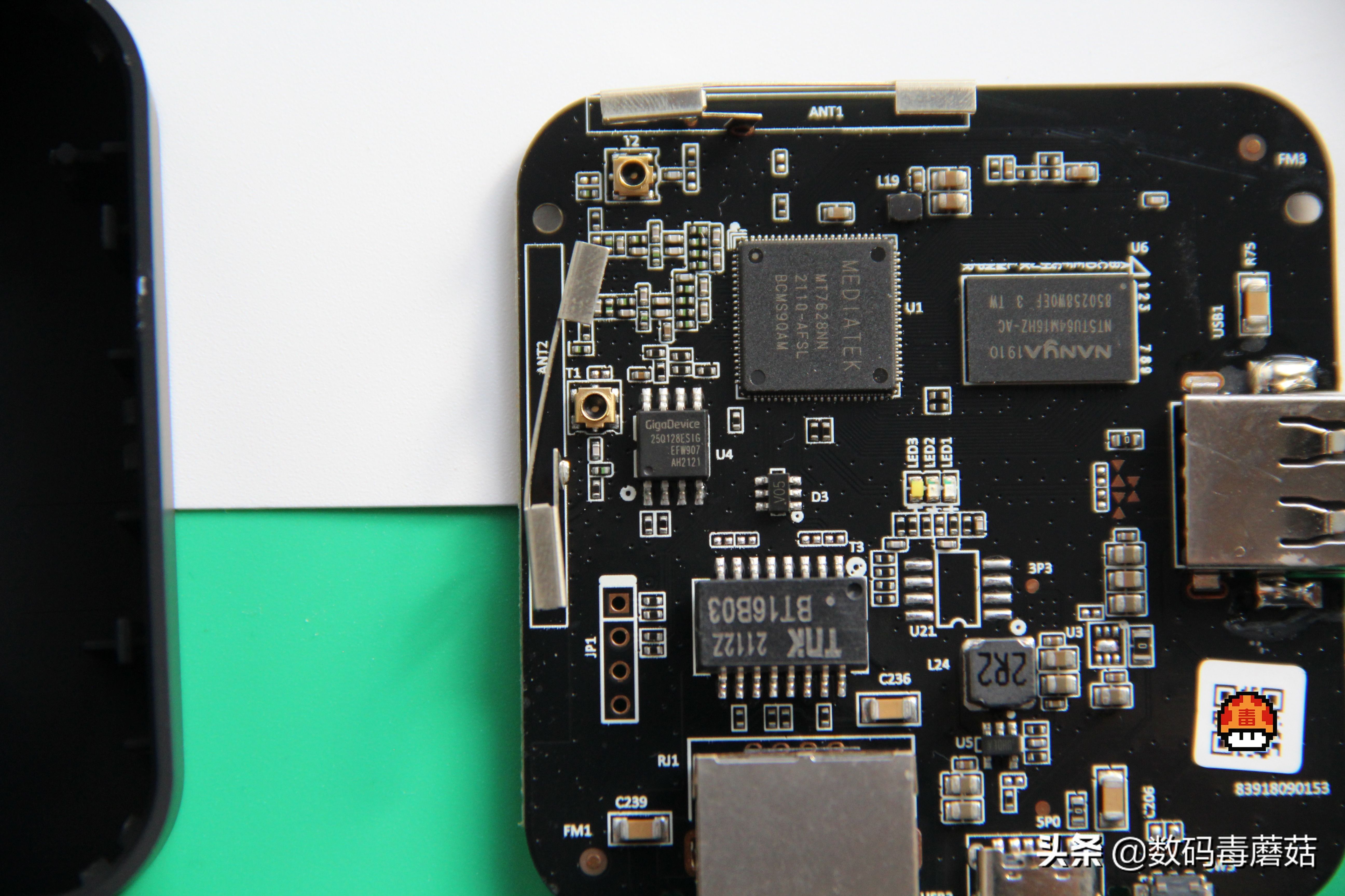 硬件配置一览。处理器为MT7628NN,运行内存为南亚NT5TU64M16HZ-AC,64Mb*16bank=1Gb=128MB的DDR2颗粒;闪存为兆易创新25Q128ESIG,容量16MB。网变BT16B03,内置两根铁皮天线,自带IPX接口可以扩展成外置。
