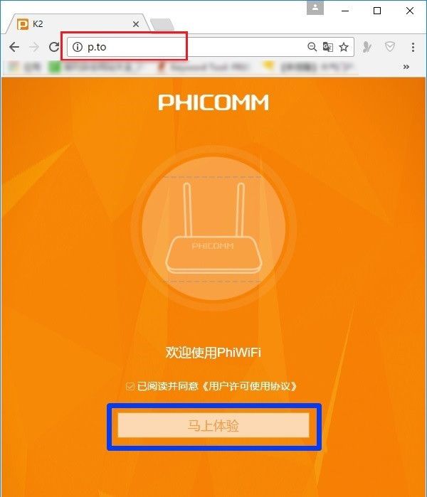 1.在电脑浏览器上打开斐讯的路由器设置管理地址P.TO或者输入192.168.2.1然后点击马上体验。
