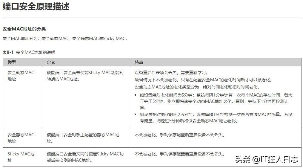 - 端口安全通过将接口学习到的动态MAC地址转换为安全MAC地址(包括安全动态MAC,安全静态MAC和Sticky MAC),阻止非法用户通过本接口和交换机通信,从而增强网络的安全性;