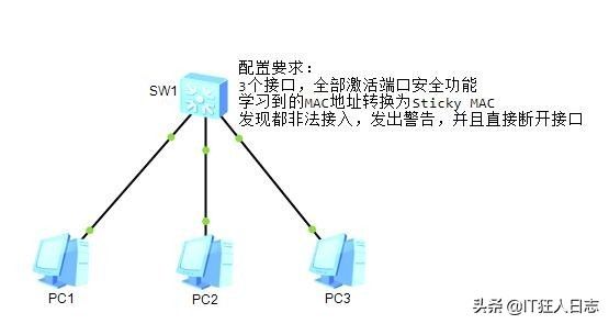 1、需求:图中3个接口,全部激活端口安全功能;学习到的MAC地址转换为Sticky MAC;