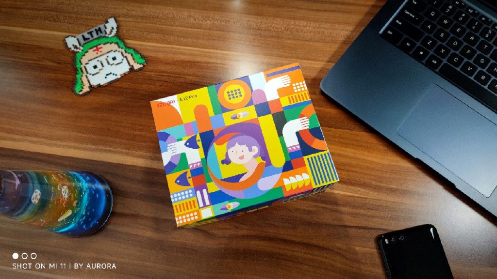 这一次,锐捷星耀E12 Pro的包装盒上印有多彩几何抽象拼接的绚丽图案绘画,整体清新活泼。在我印象中,锐捷星耀的美工一直挺棒的,每一次的包装盒设计得都很精美。