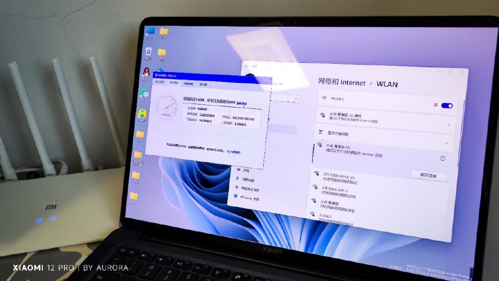 下面,开始放大效果评测:在中国电信200兆光宽带下接入小米千兆版路由器作为主路由器(由于锐捷星耀E12 Pro 放大器不支持WiFi 6,所以选择同样不支持WiFi 6的小米路由器),仅测试5GHz频段的下载速度(2.4GHz测试意义不大)。首先,主路由器5GHz近距离网速效果PC实测如图:(测试设备:小米笔记本Pro X 15+腾讯电脑管家网速测试软件)