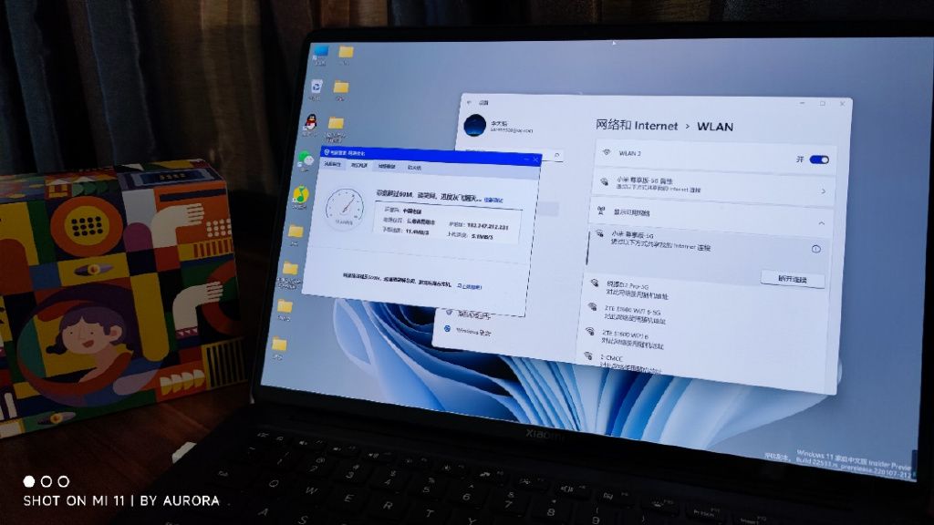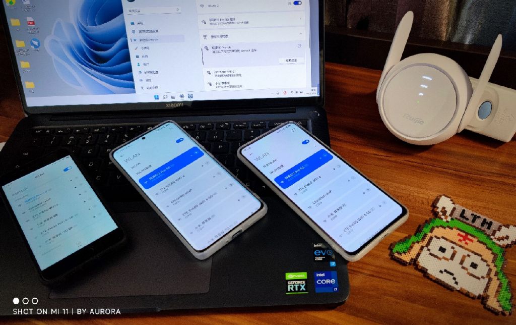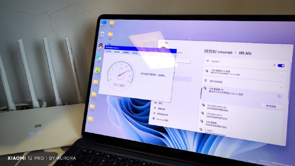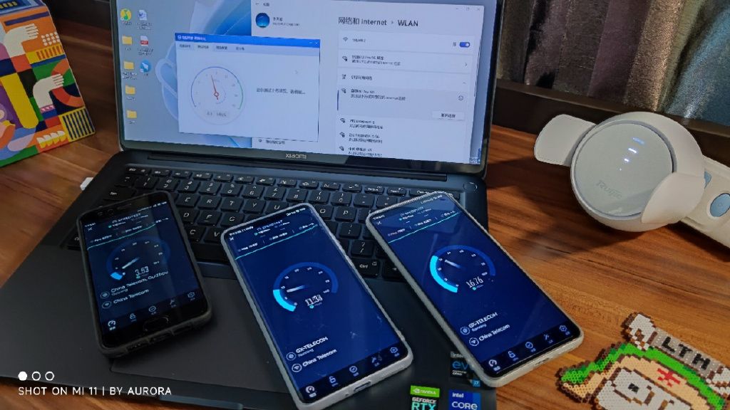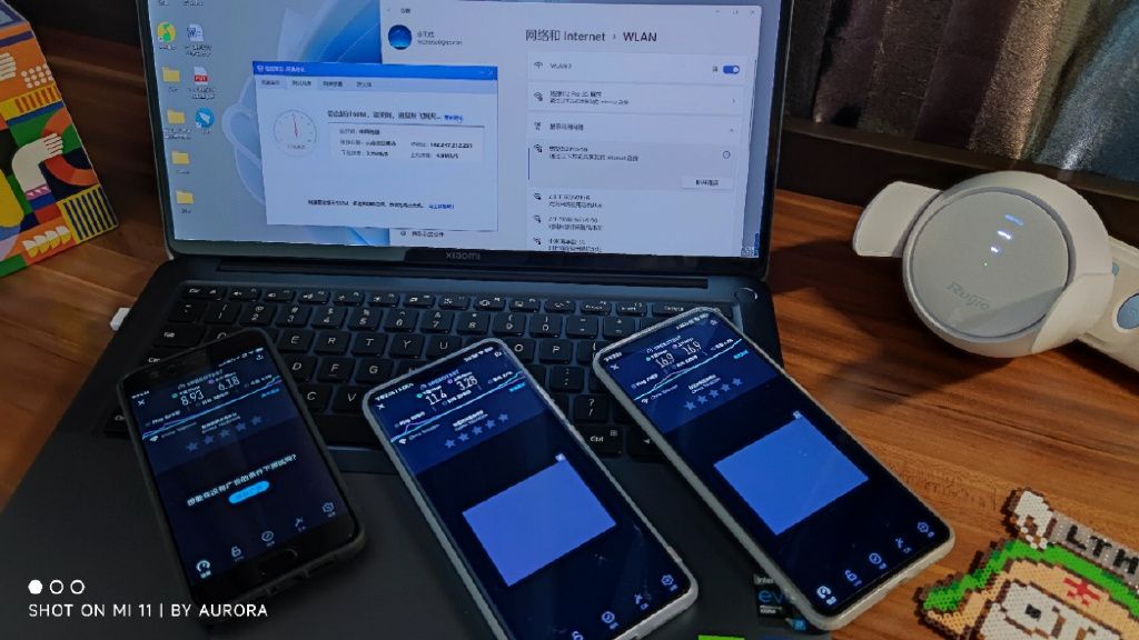 最后我们测试放大器的多设备负载能力。我们使用小米笔记本Pro X 15,小米12 Pro,小米6和Redmi K30 Ultra连接上锐捷 星耀E12 Pro的5GHz频段,同时开始测速抢网速,如图: