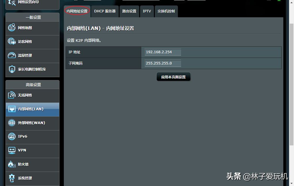 在内部网络中有四项基本内容的设置:内网地址设置、DHCP服务器、路由设置、IPTV、交换机控制,其中内网地址设置、DHCP服务器设置与前面说过的内容比较相似,也比较简单,可以参考: