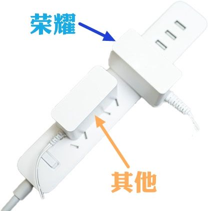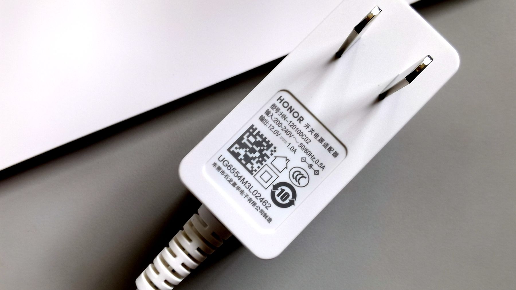 12V1A的电源适配器,功率还不小。特别要说这个电源插头的设计,细节决定成败啊,你看看下图就懂了。怎么样,还是荣耀的插头设计得当吧。