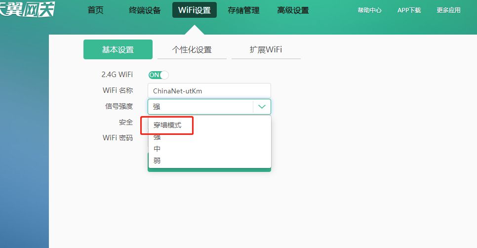 第五步:我们在信号强度这里选择穿墙模式