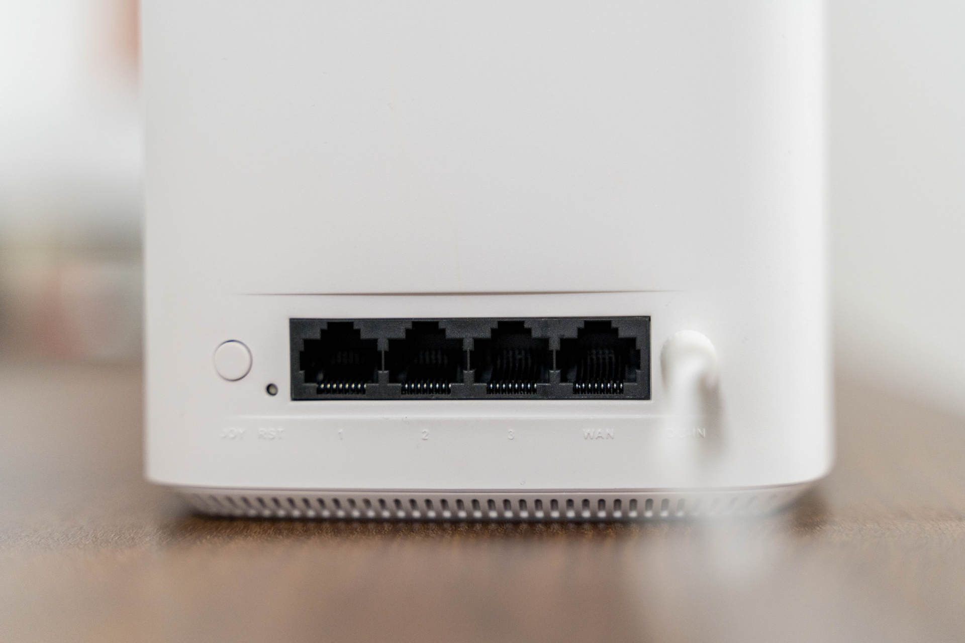 在背部的接口方面,同样也非常的丰富。一个WAN口,三个LAN口,一共有三个输出接口,笔记本电脑接一个口,电视接一个口,还有一个口可以接入其他的设备。这款路由器的端口基本满足了我们使用的需求。除了网线接口方面,在网线旁边是电源接口复位键和JOY键。相对于其他的一个路由器,旁边多了一个JOY的按键,短按可以对指示灯进行关闭,长按大于三秒可以进行mesh组网。不过现在目前是不支持组网的,后续会更新固件来支持组网功能。