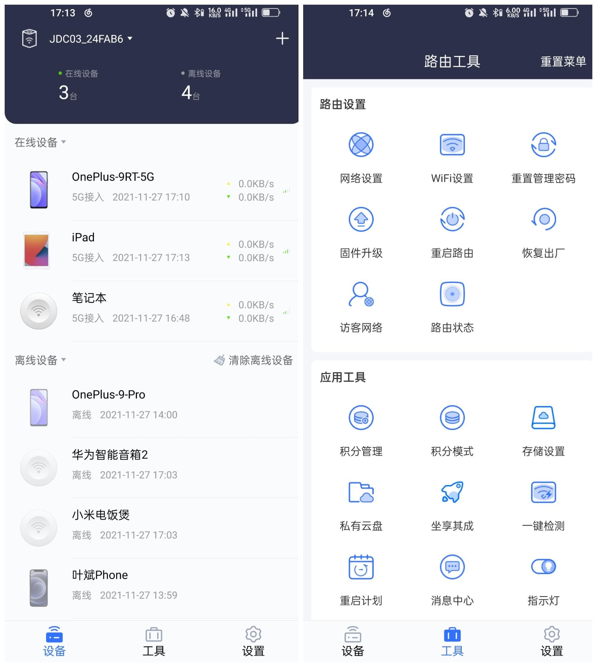 连接路由器的设备可以通过列表清晰地在主界面展示,主界面可以显示在线设备、离线设备、黑名单设备。可以在首页清晰地看到,上传速度以及信号强度。还可以针对单个设备进行访问控制,包括修改设备名称,禁止设备联网等功能。在第二页有更多的工具,小小的软件集成很多的使用的功能,相对于普通的路由器,体验起来方便不少。