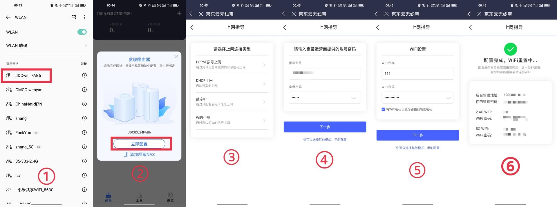 整个配网过程还是相对比较简单的,在WiFi的设置界面找到这款路由器的初始配网 WiFi名称。然后再下载京东云无线宝,然后选择增加路由器。 选择我们运营商提供的网络连接方式,比如说我家就是需要用宽带密码账号进行拨号的上网方式。输入上宽带和密码,然后配置一下WiFi名称和密码,就设置完成了。
