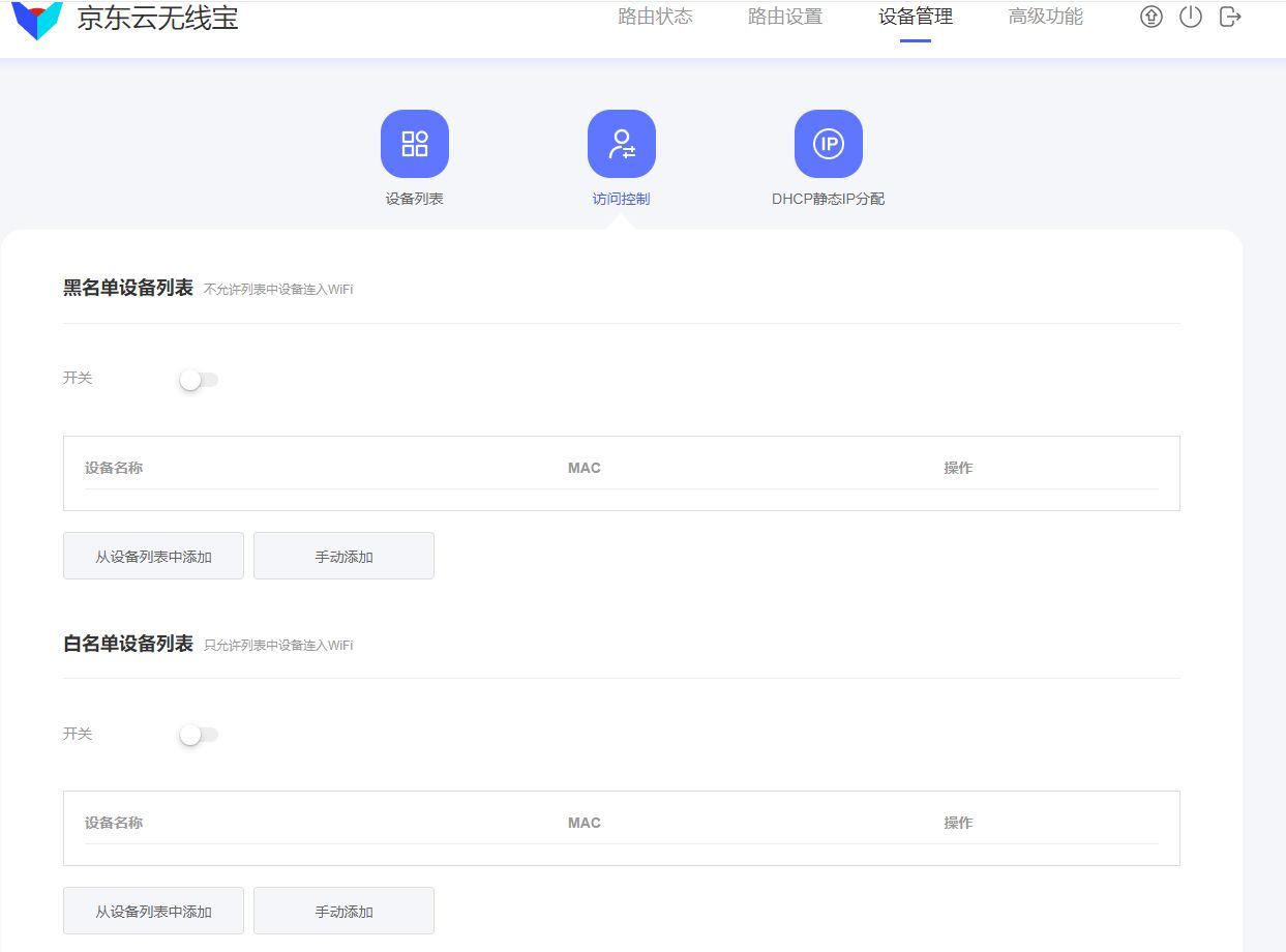 如果有人蹭网也不必担心,京东无线宝云路由64G版可以把蹭网设备加入黑名单。同时如果有邻居向你借网,又怕导致网络卡顿,但又不得不借,这时候可以对部分进行单独限速。