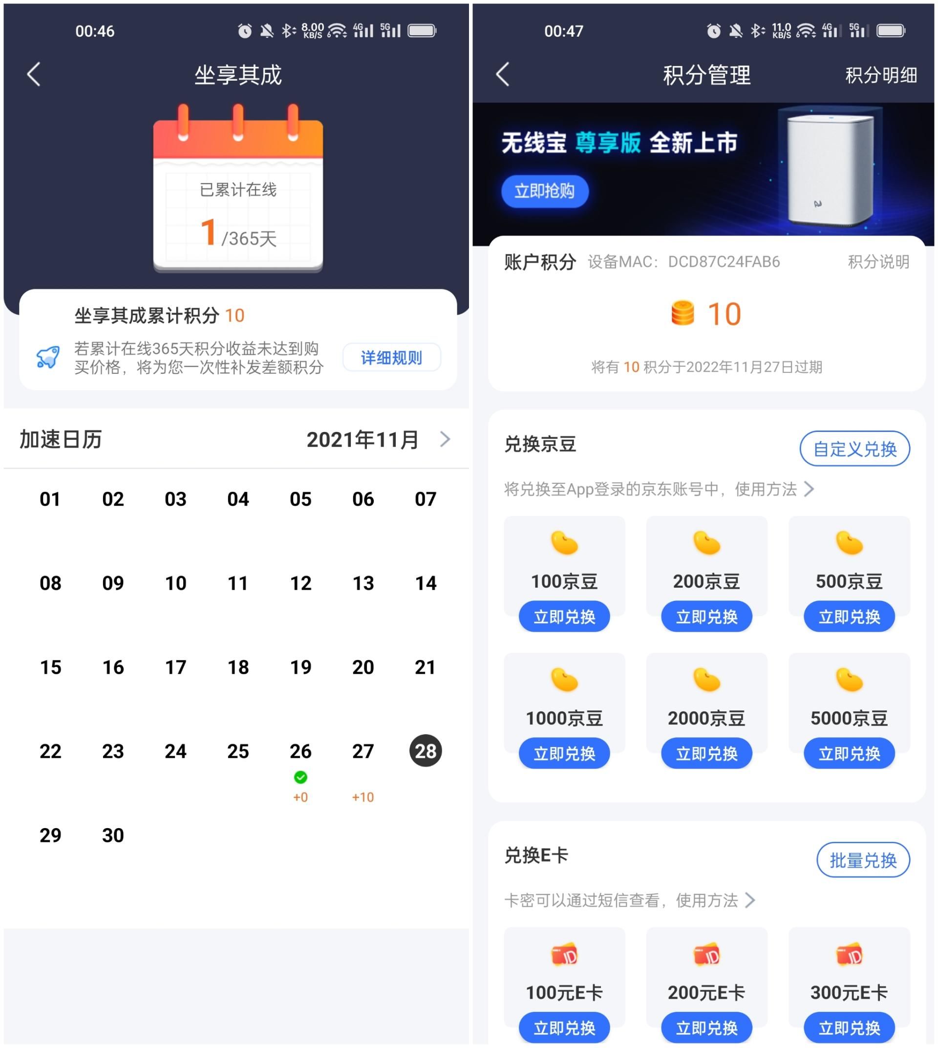 先说一下京东无线宝云路由64G版的基本的规则,通过共享带宽,来赚取积分(1:1兑换京豆,100京豆为1元),同时也可以获取京东E卡。E卡不要,也可以通过第三方平台折换成RMB。
