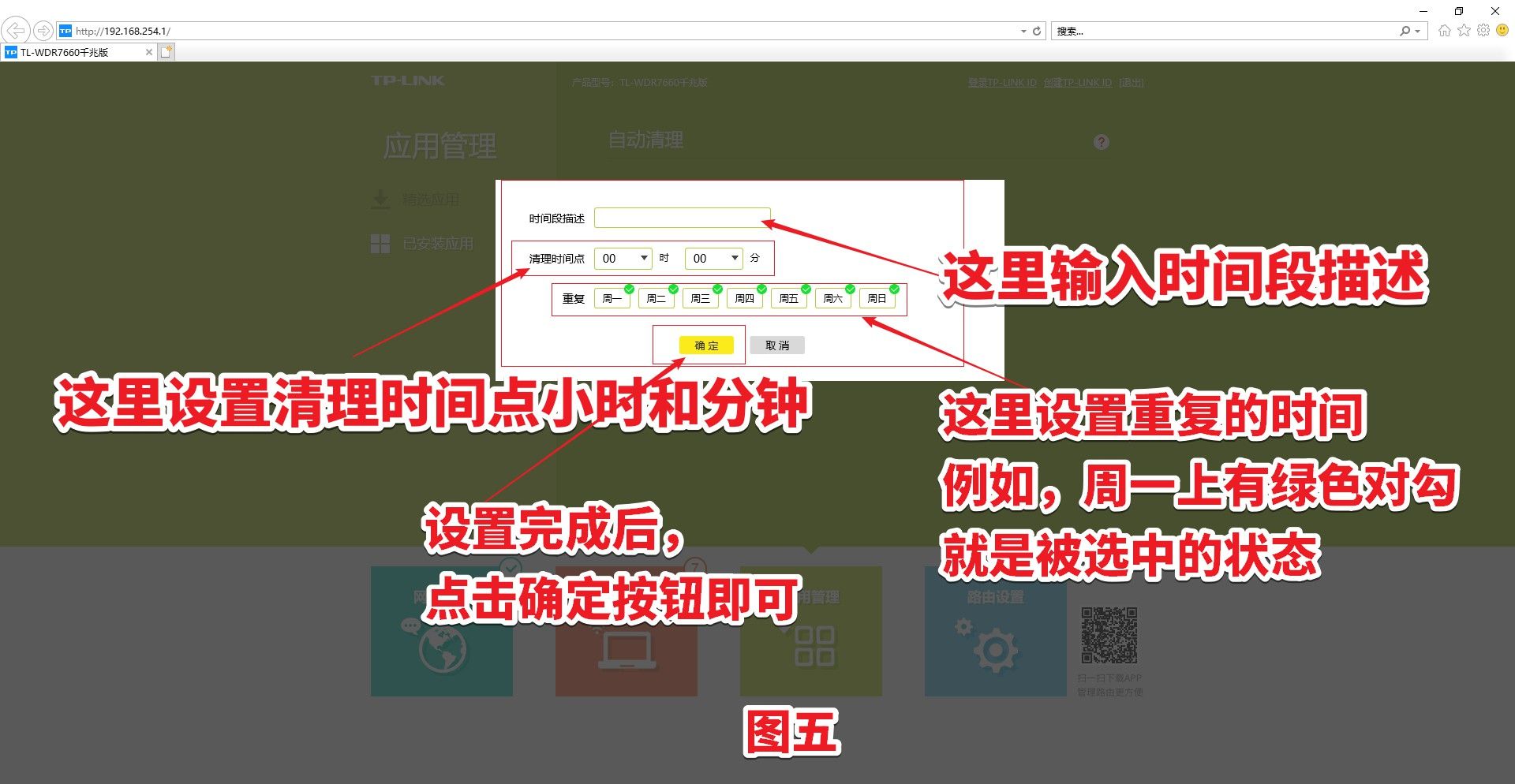 这里输入时间段描述,可以输入自动清理就可以了,也可以输入其它名称,然后下面的位置设置清理时间点小时和分钟,设置重复的时间,例如,周一上有绿色对勾就是被选中的状态了,设置完成后,点击确定按钮即可,具体看图五。