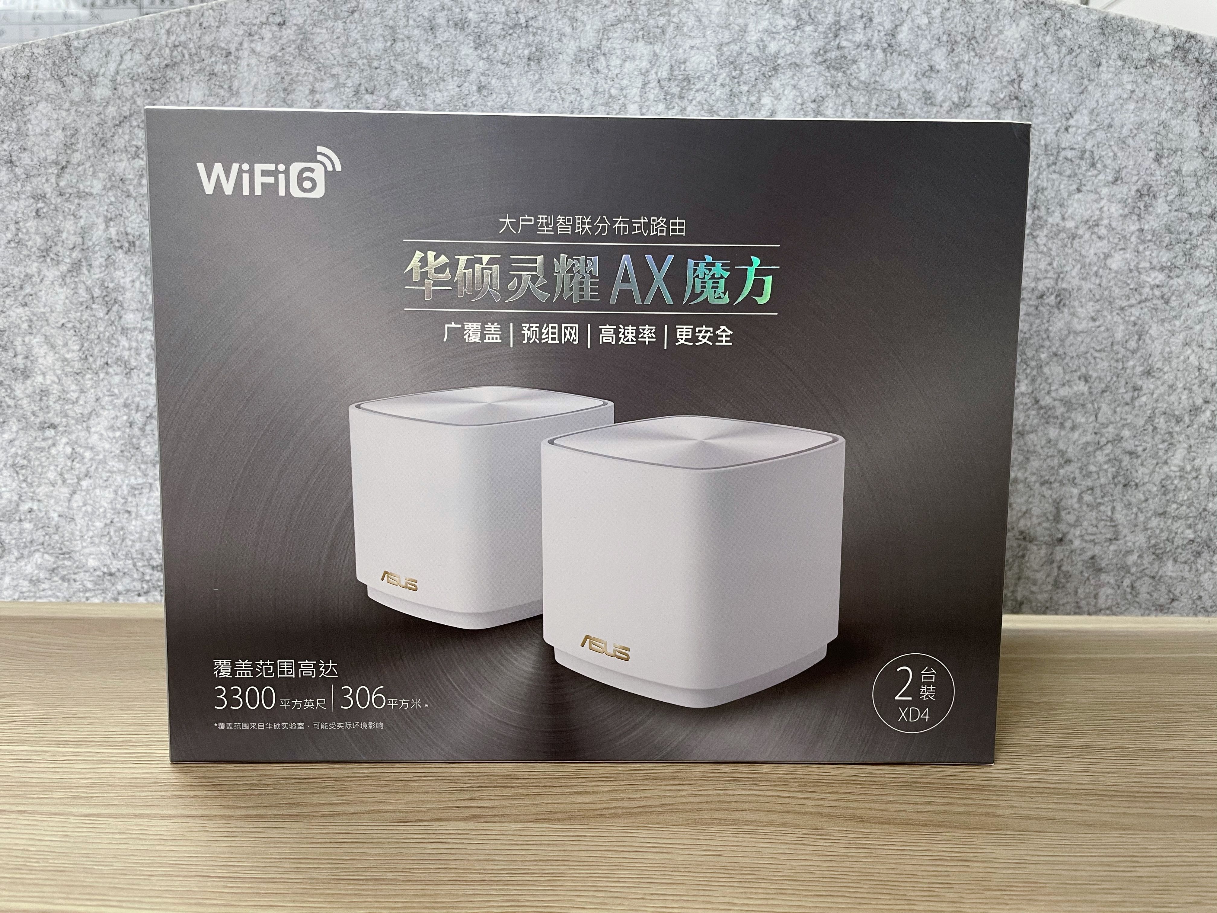 华硕XD4灵耀魔方分布式路由器外包装盒正面就能看到产品的渲染图,总共有2台路由器,在其左上角有使用WiFi-6的标识,产品可以覆盖306平方米。