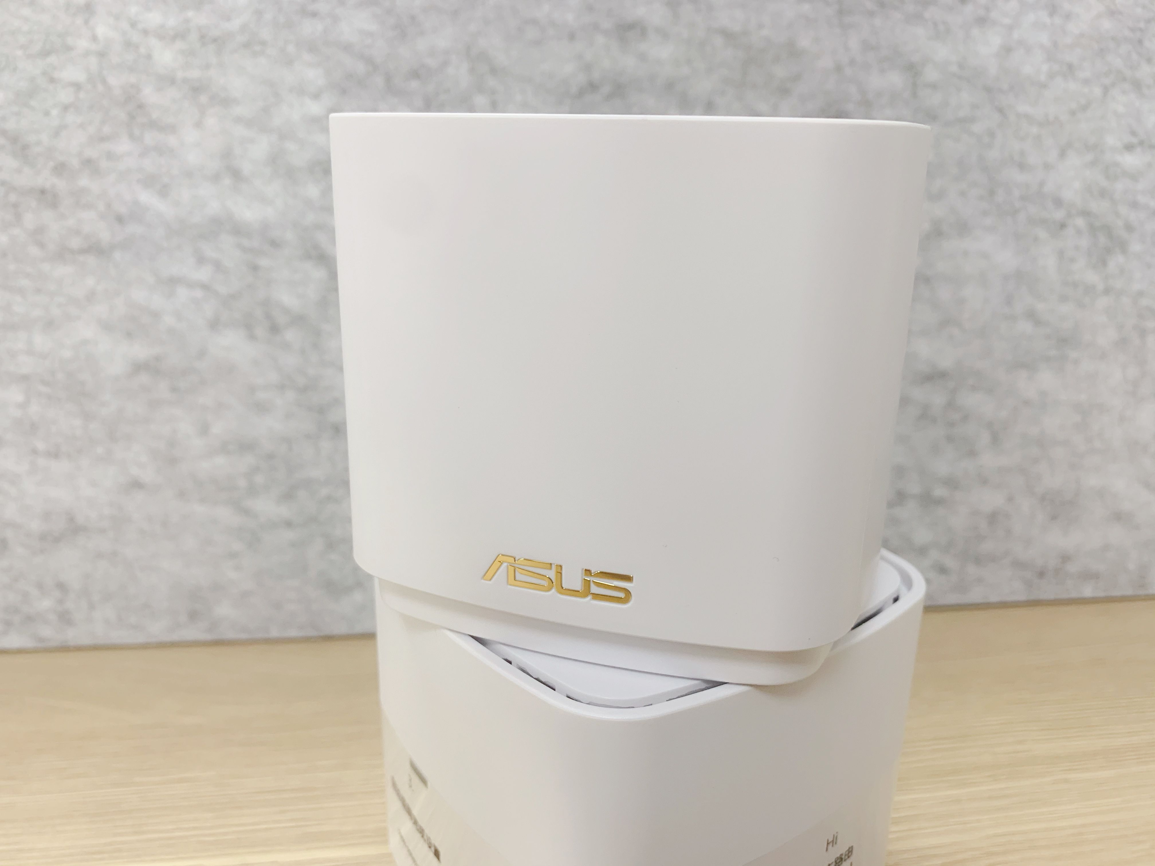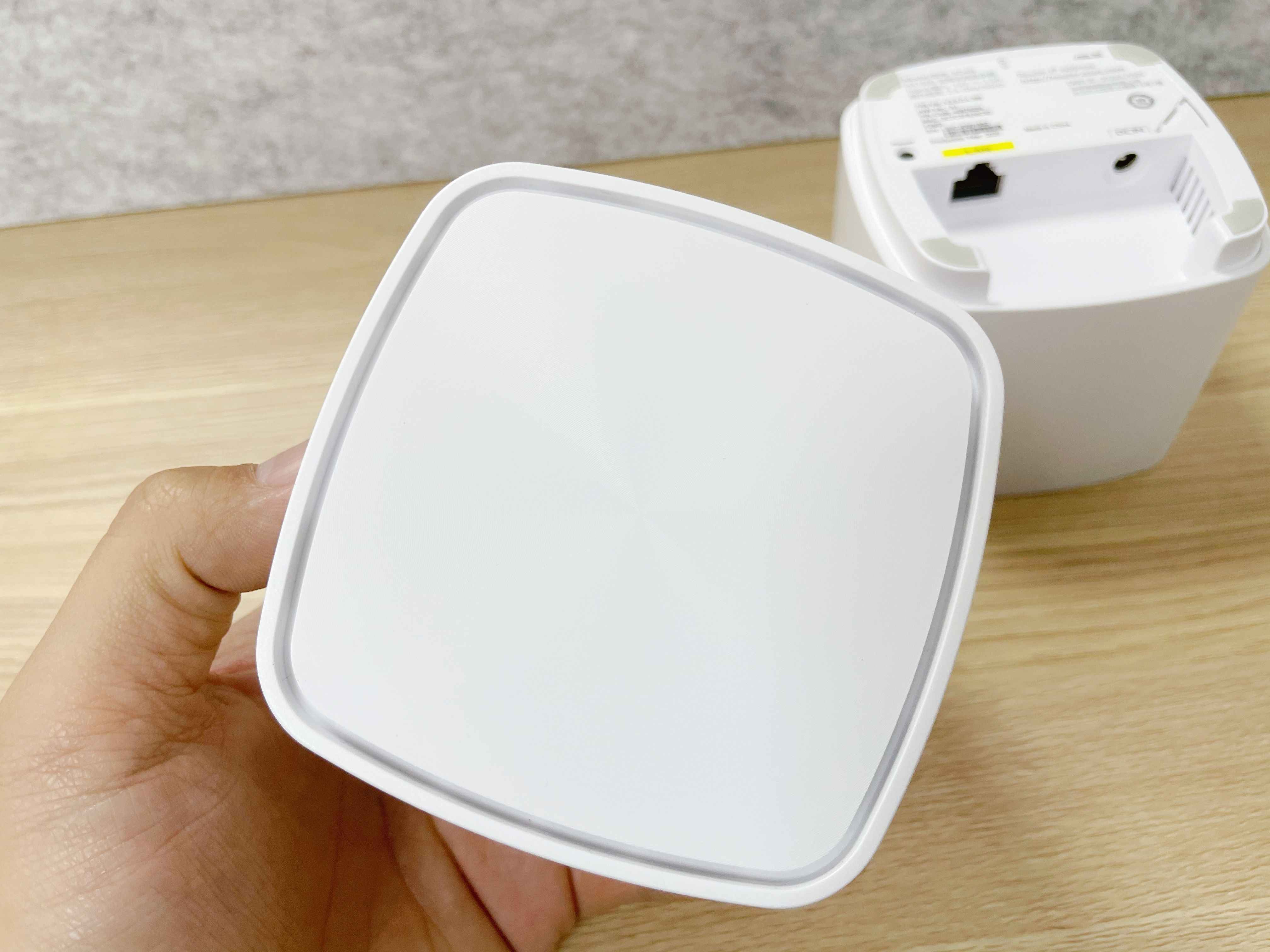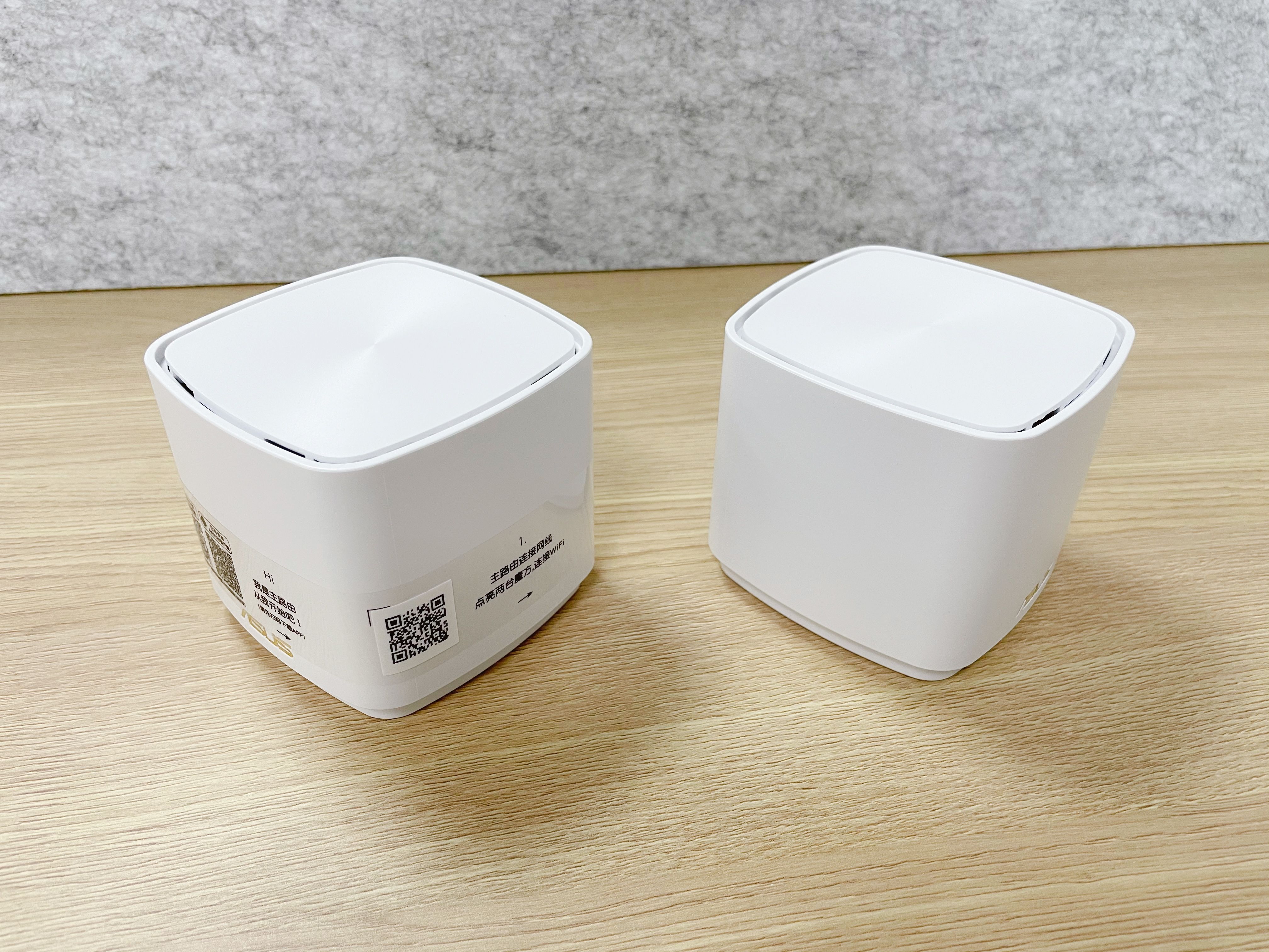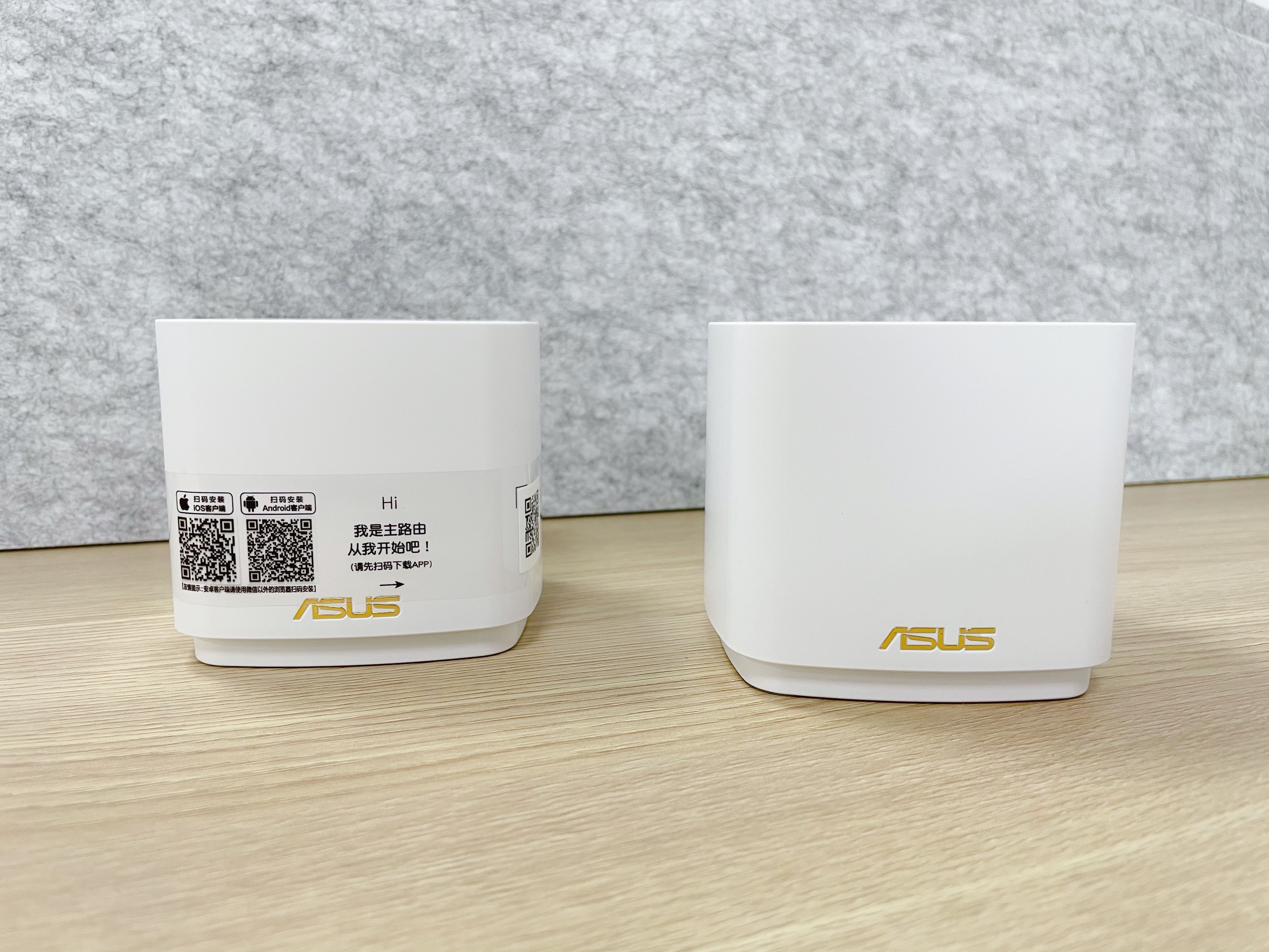 在去掉主路由器上的说明带,两台路由器在外观上基本上没有区别。采用白色路由器正面使用烫金的logo图案。外形采用方形结构,只有巴掌大小,相比较其他路由器的体积,华硕灵耀AX魔方算得上比较小巧,不占地方。