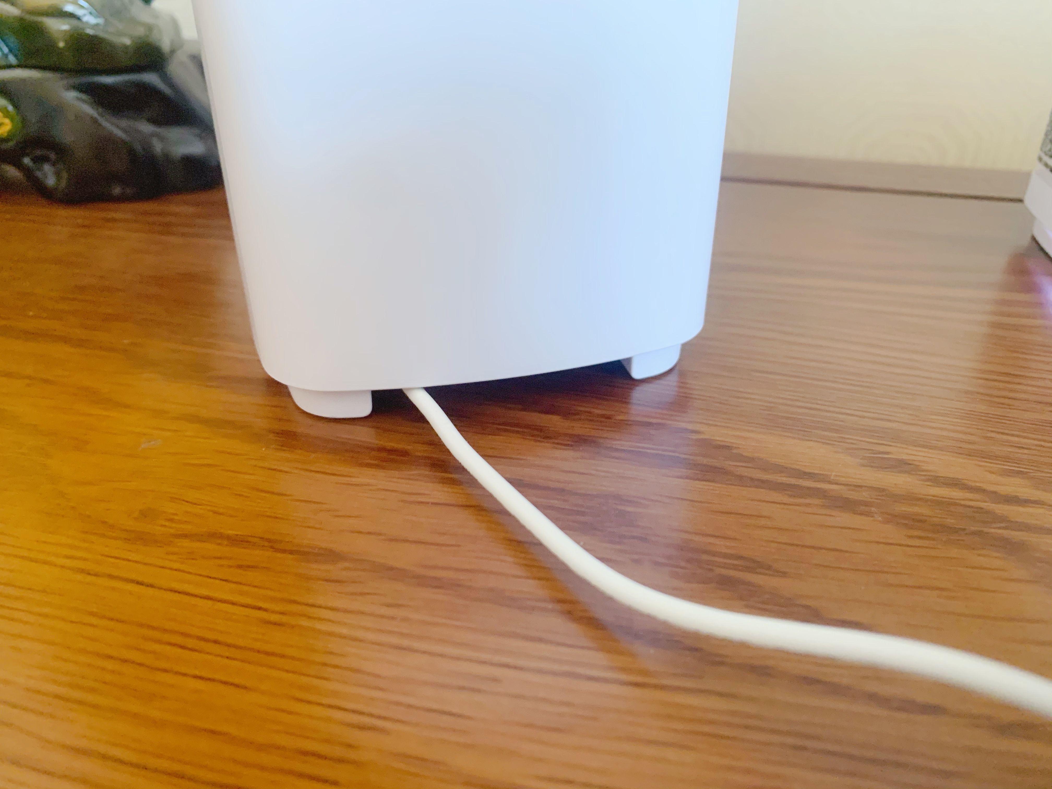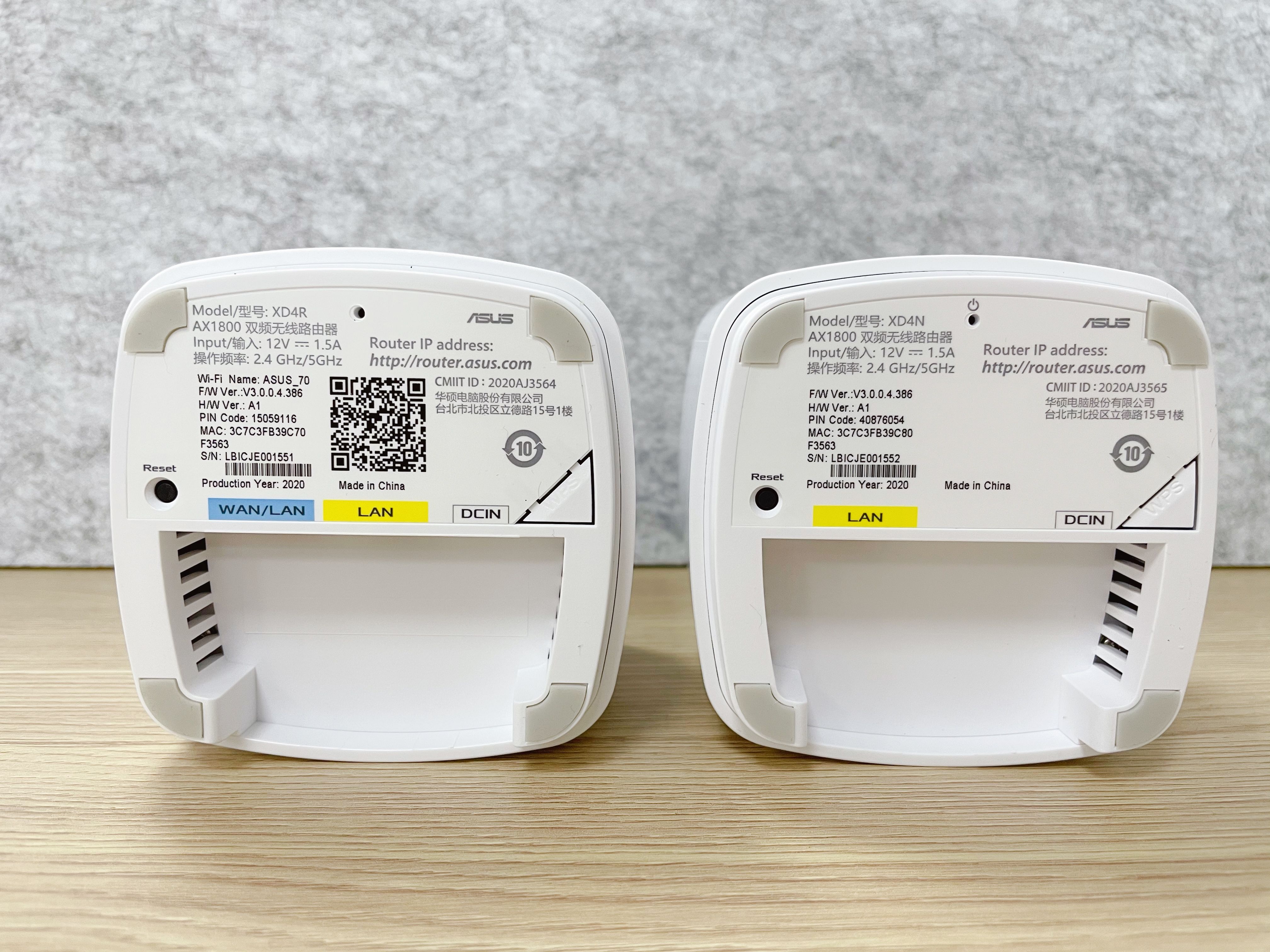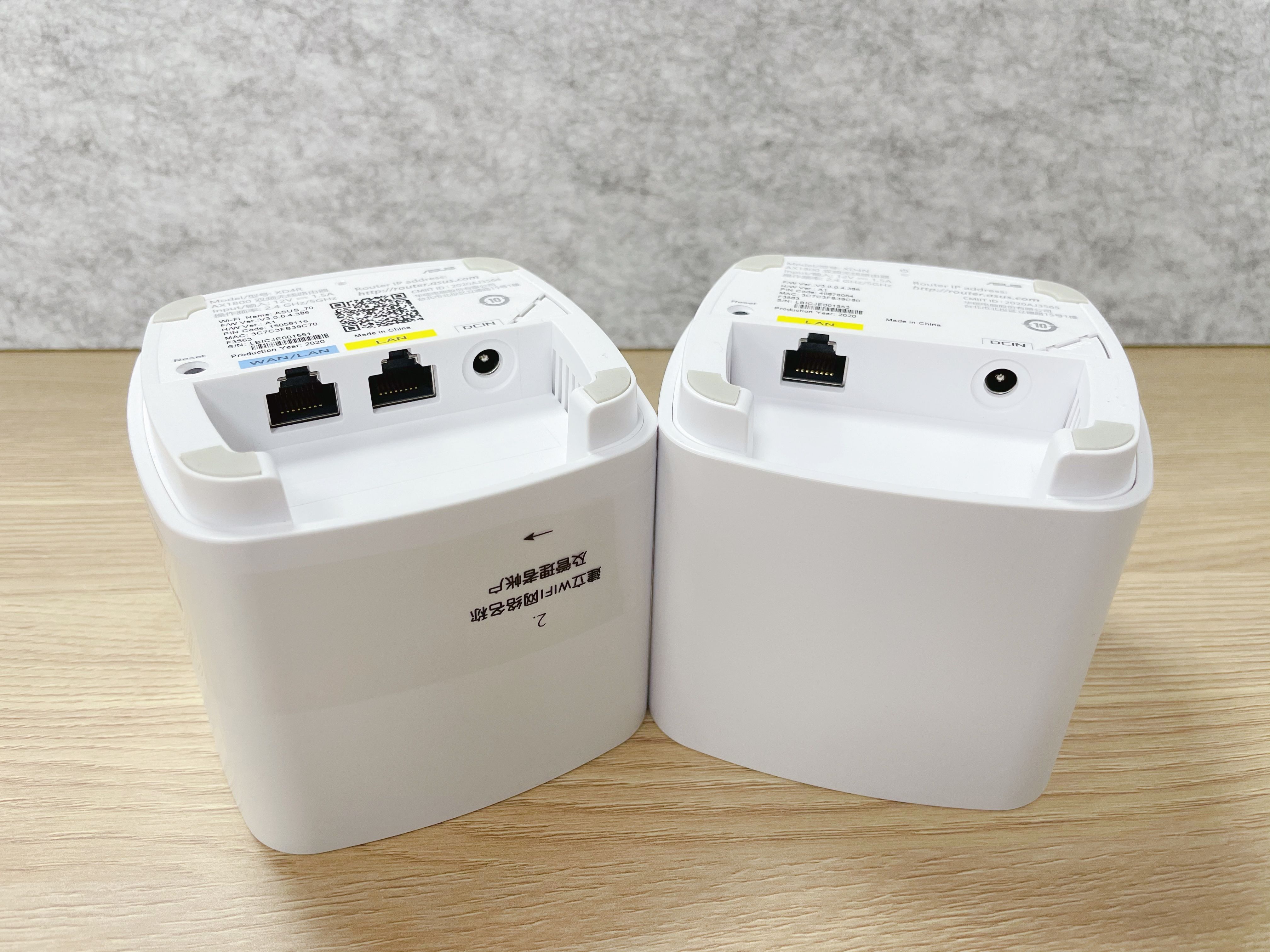 从底部就能区分哪个是主路由器哪个是节点路由器。主路由器在接口上多一个千兆WAN口,还有个千兆LAN口以及电源接口,而节点路由器只有千兆LAN口和电源接口。另外两台路由器上都有黑色reset键。在路由器底部留有一定高度的缺口,方便排线还不影响路由器的美观。