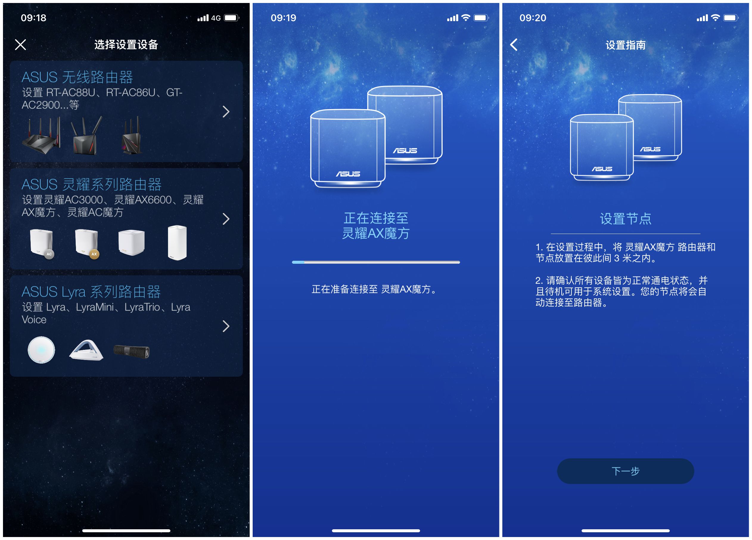 由于3楼电脑处网线接口是损坏的,两台路由器只能在2楼安装调试完成之后把节点路由器放在3楼使用。没有电脑就在手机上完成对华硕灵耀AX魔方的设置。首先下载ASUS Router APP,选择需要设置的设备,然后就是根据提示进行连接华硕灵耀AX魔方,同时也会直接设置节点路由器,无需二次操作。