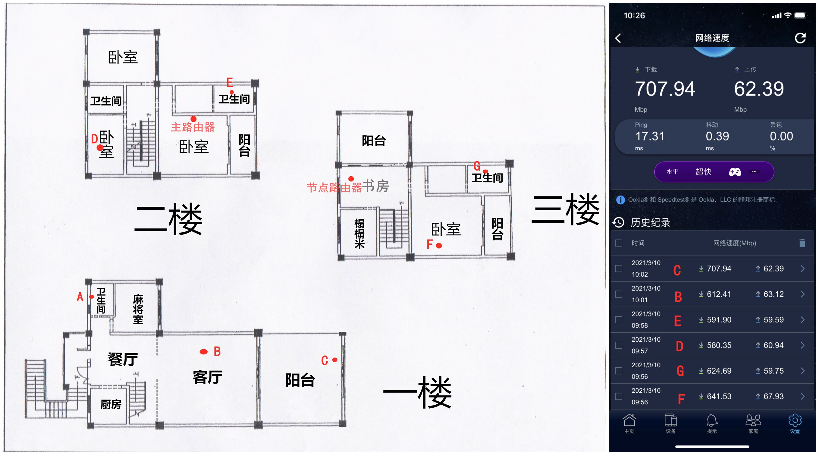 测试环境3层楼房,测试设备iPhone XR,测试网速APP ASUS Router。我家前两天升级的移动千兆光纤,华硕灵耀AX魔方分别安装在2楼卧室和3楼书房。测试下来在没有遮挡物或者只有一堵墙的时候信号都是满格,然后网络速度在600Mbp左右。例如在二楼小卧室有2堵墙信号则变成了2格,网络速度在500Mbp左右。在1楼厕所A点处测试经常出现断开连接,无法测试网络速度,信号非常弱。总体来讲2台华硕灵耀AX魔方基本上能够覆盖我家网络。