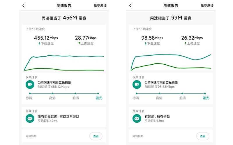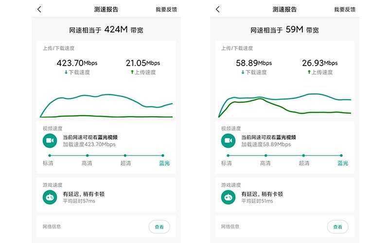 通过各组数据的对比中,明显可以发现在WIFI6 5G频段下的带宽可以平均达到450M左右,同时网络信号的传输效率不会因为隔墙的原因而有大幅度的衰减,相比2.4G频段更加的稳定。这样我们在线观影就可以达到秒开的条件,多个联网设备连接也能将信号干扰降至最低。