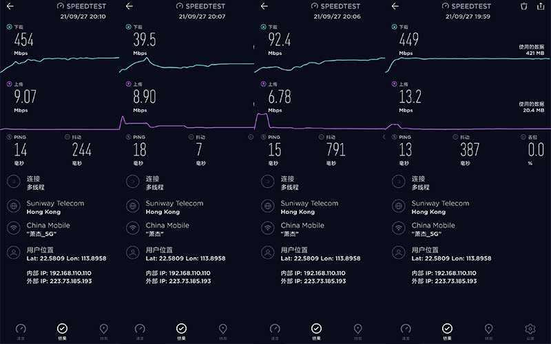 接着使用第三方软件“Speedtest”,依照同等的测试条件,先靠近路由器实测2.4G和5G两个频段的WiFi数据为92.4Mbps和454Mbps,接着依然是两道隔墙进行测试,实测数据为39.5Mbps和449Mbps。