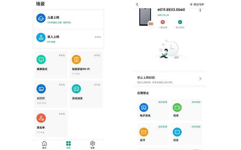 APP上还加入了很多的拓展功能,其中就包含了儿童上网、客人上网、健康模式、智能家庭、云打印、游戏加速和黑名单。儿童上网的功能可以为孩子的联网设备设置禁止上网时段,限制在线游戏、视频、支付、社交以及应用下载行为,并且支持网址拦截功能,控制孩子的上网行为,培养孩子健康上网的意识。