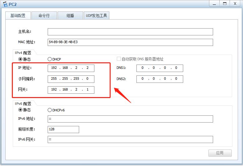 路由器R2上配置接口IP和去往PC2的静态路由:
