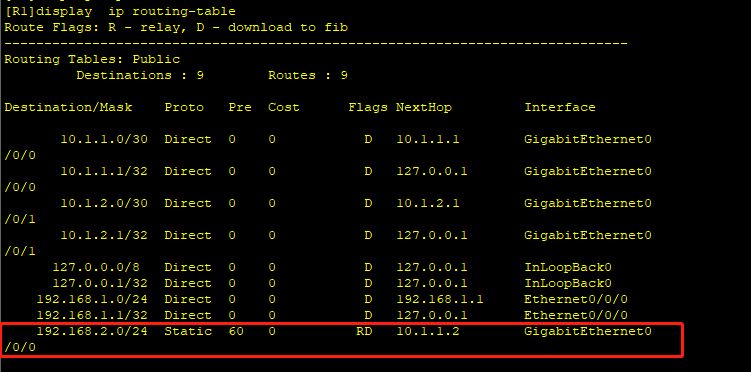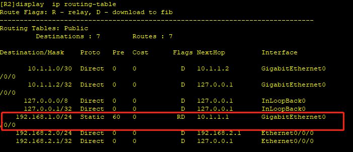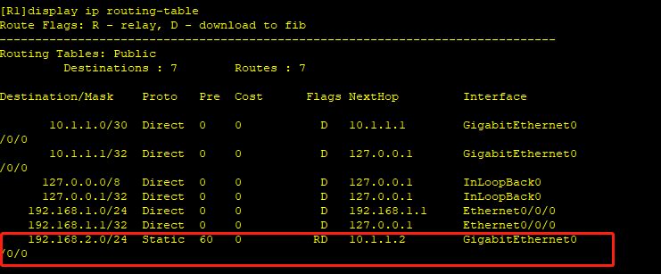 在配置完静态路由之后,可以使用display ip routing-table命令来验证配置结果。