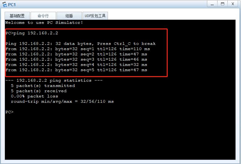 结果验证: PC1上ping PC2, 结果显示可以ping通