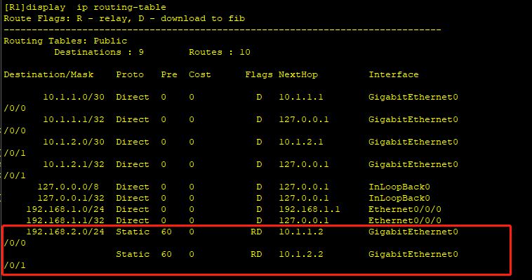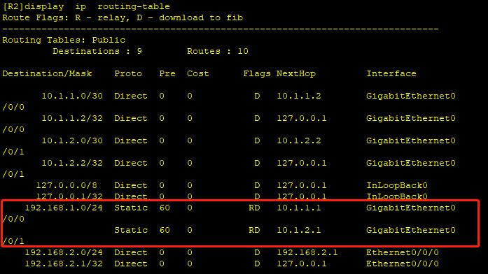 在本示例中,红框部分代表路由表中的静态路由。这两条路由具有相同的目的地址和掩码,并且有相同的优先级和度量值,但是它们的下一跳地址和出接口不同。此时,R1就可以通过这两条等价路由实现负载分担。
