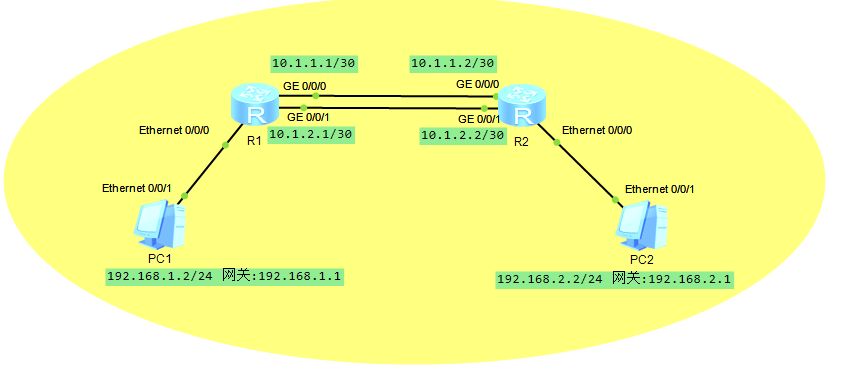 本示例中R1和R2之间有两条链路相连,通过使用等价的静态路由来实现流量负载分担。