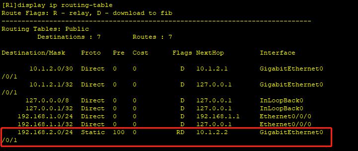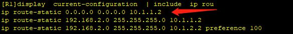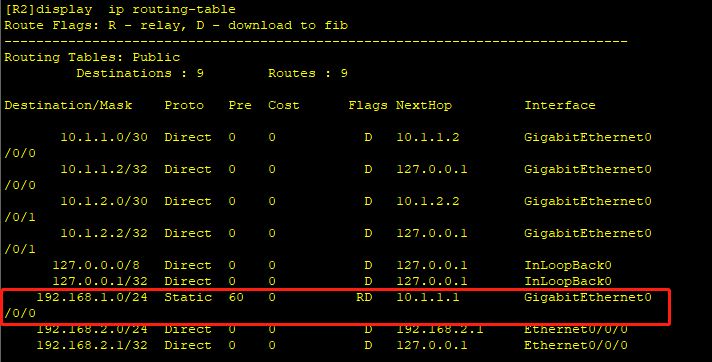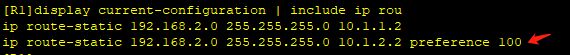 正常情况下,路由表中应该显示两条有相同目的地、但不同下一跳和出接口的等价路由。由于修改了优先级,回显中只有一条默认优先级为60的静态路由。另一条静态路由的优先级是100,该路由优先级低,所以不会显示在路由表中。