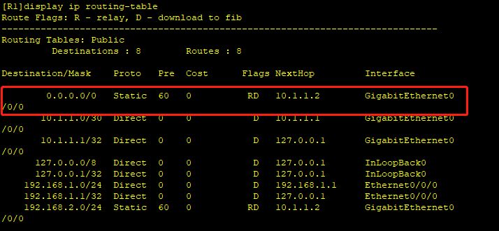配置缺省路由后,可以使用display ip routing-table命令来查看该路由的详细信息。在本示例中,目的地址在路由表中没能匹配的所有报文都将通过GigabitEthernet 0/0/0接口转发到下一跳地址10.1.1.2。
