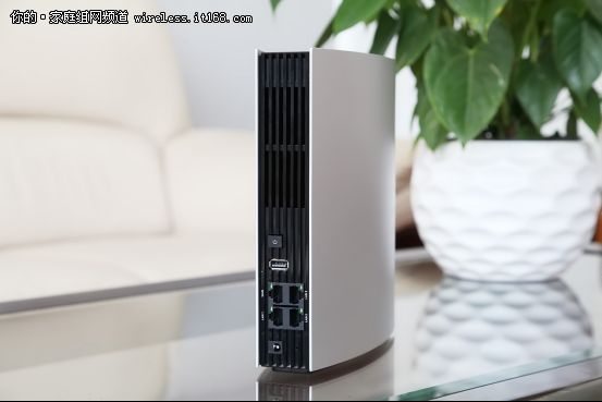 斐讯K3机身背面为大面积的散热栅栏,下方为多个端口设计,和斐讯K3别无二致,从上向下依次为电源开关键、USB3.0端口、4个网络端口(1个千兆WAN口、3个千兆LAN口)、电源接口和复位按钮。