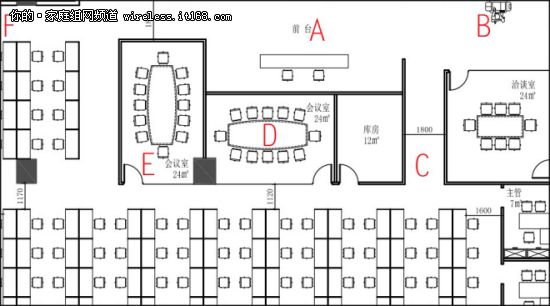 首先我们对斐讯K3C的信号覆盖能力进行了测试,我们在公司内部找了ABCDEF六个测试点,其中A点为设备测试点,通过BCDEF五个点的信号情况判断其信号覆盖能力。