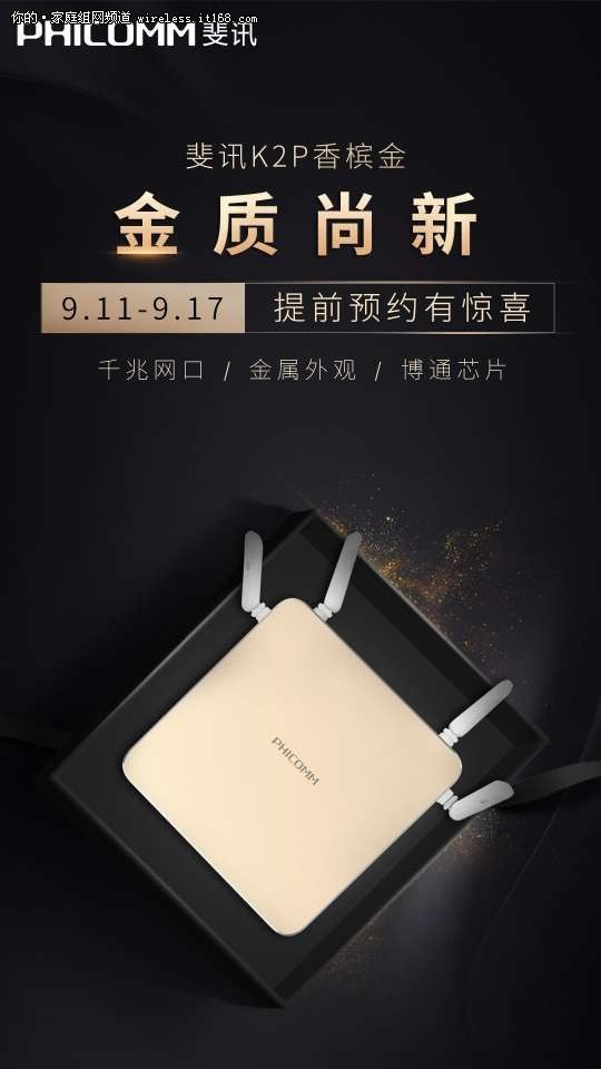 当然,如果您觉得1399的价格还是略高,那我们可以考虑下斐讯的另一款无线路由器产品——斐讯K2P,官方价格仅需799元,但同样通过分期返现的方式实现“0元购”,9月11日更是在京东斐讯官方旗舰店推出香槟金版斐讯K2P无线路由器,有兴趣的朋友可以提前进行预约,预约地址:https://item.jd.com/4956301.html