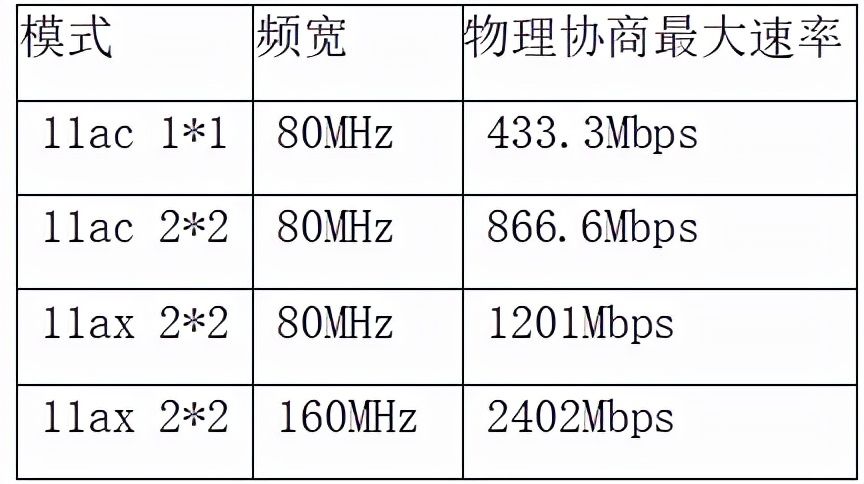 上图列举出最常见的WIFI 2.4G对应频宽中的最大协商速率,最大协商速率是只终端在离路由器足够近的距离时的协商速率值,非实际测速值。