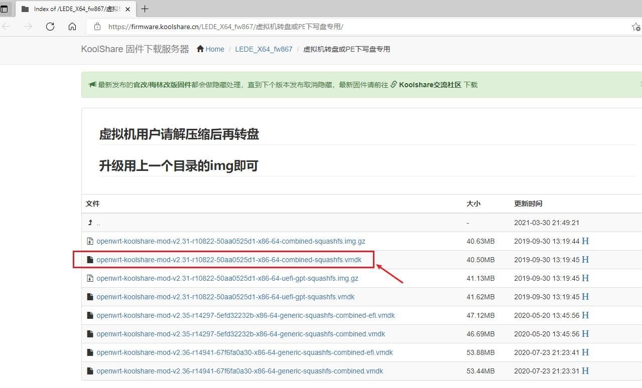 3、我们登录到koolshare社区,依次点击固件,LEDE_X64_fw867,虚拟机转盘或PE下写盘专用。