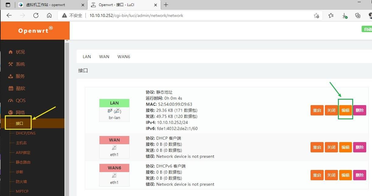 2、接下来,我们点击网络 —— 接口,编辑一下LAN口: